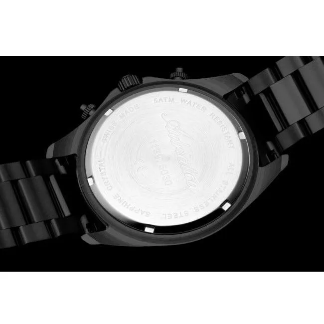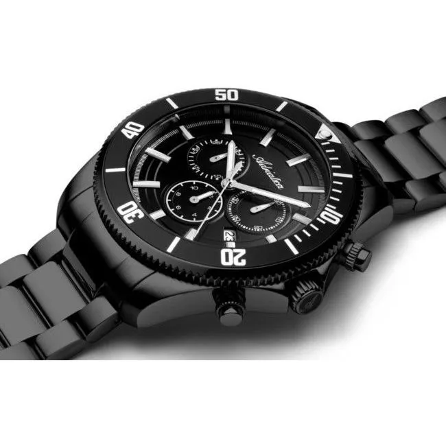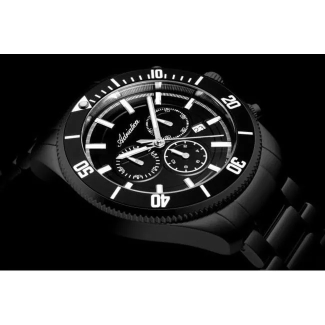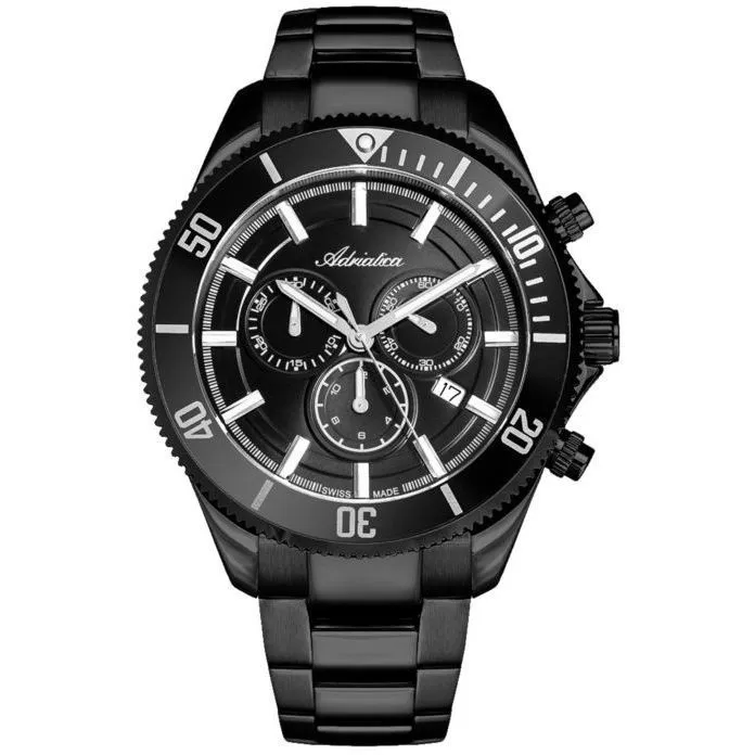 Czarny zegarek męski Adriatica A1139.B116CHN z bransoletką składającą się z ogniw w czarnym kolorze. Czarną tarczą z indeksami i z datownikiem. Szwajcarski zegarek z mechanizmem Ronda.