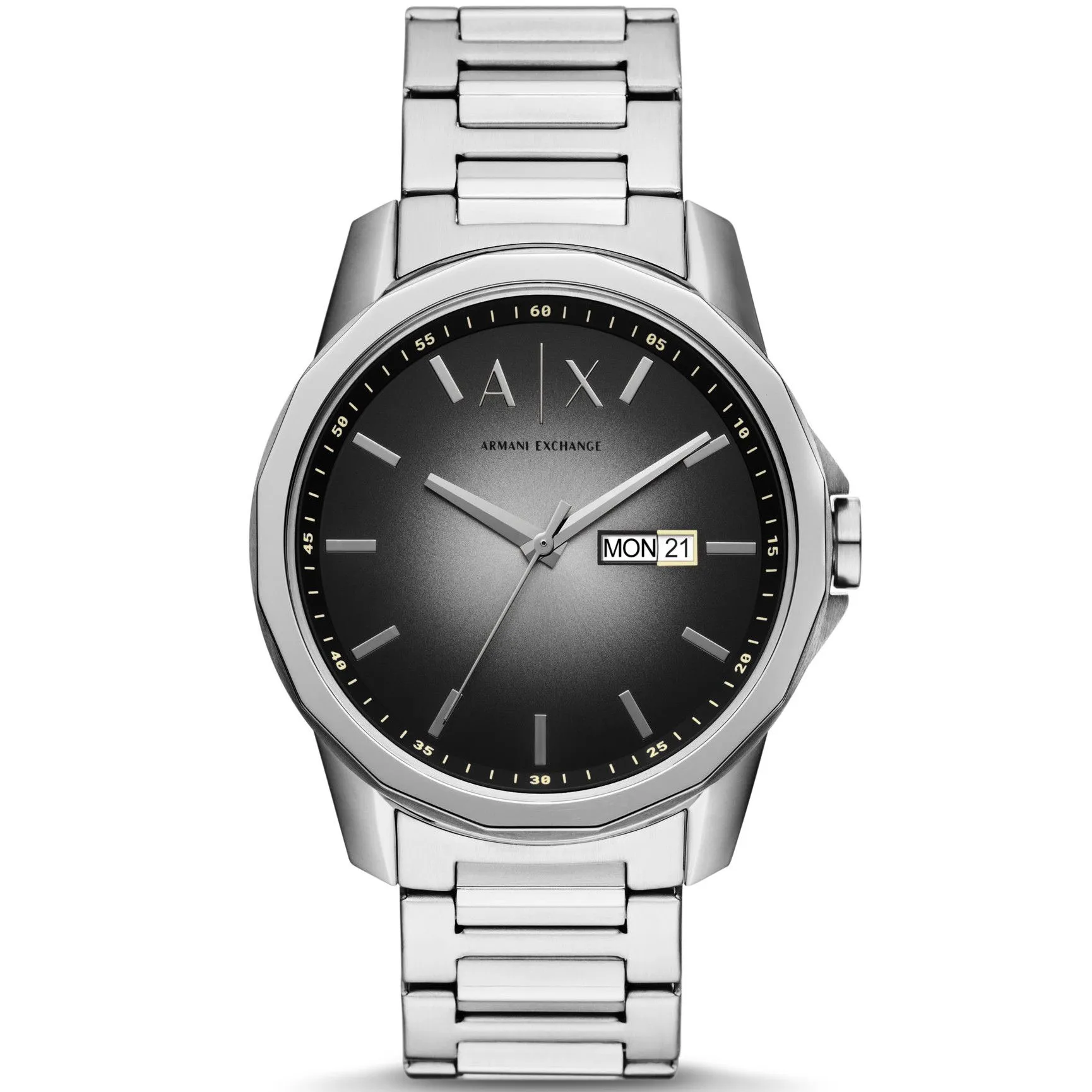 Srebrny zegarek męski na bransoletce z cieniowaną tarczą AX1764. Datownik i kwarcowy mechanizm zapewniają wysoką dokładność wskazań. Znana marka Armani Exchange i kolekcja Banks.