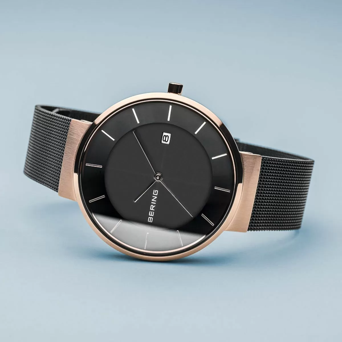 Bering 14639-166 to zegarek, posiadający klasyczną okrągłą kopetę, wykonaną z wysokiej jakości stali - jest ona odporna na korozję i zapewnia wysoki komfort użytkowania na co dzień. Jej wymiary sprawiają, że znakomicie prezentuje się na każdym nadgarstku. Dopasowano do niej bransoletkę plecioną ze stali, typu mesh w czarnej powłoce. Obudowa ma eleganckie polerowane wykończenie.