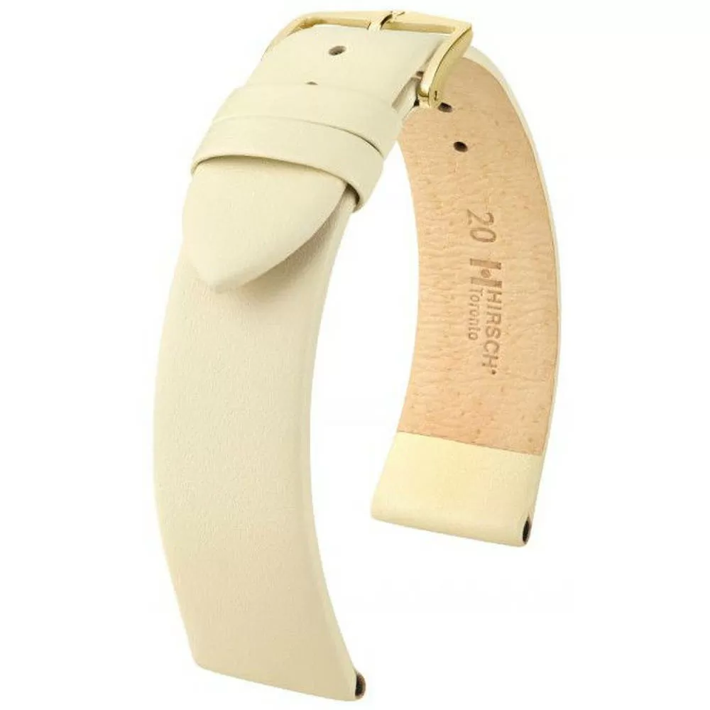 Nowy elegancki płaski beżowy pasek skórzany z lini HIRSCH Softglove lining leather "twardy na zewnątrz, miękki w środku" to motto tego dyskretnie eleganckiego paska Wykonany ręcznie  z drobnoziarnistej włoskie skóry cielęcej. Rozmiar 14 mm, klamerka w kolorze złotym , ceniona austriacka marka Hirsch. Toronto jako model należy do rodziny produktów Untruktured leather . Brak przeszycia dodaje mu eleganckiego charakteru i delikatności tak ważnej dla właścicieli klasycznych zegarków.