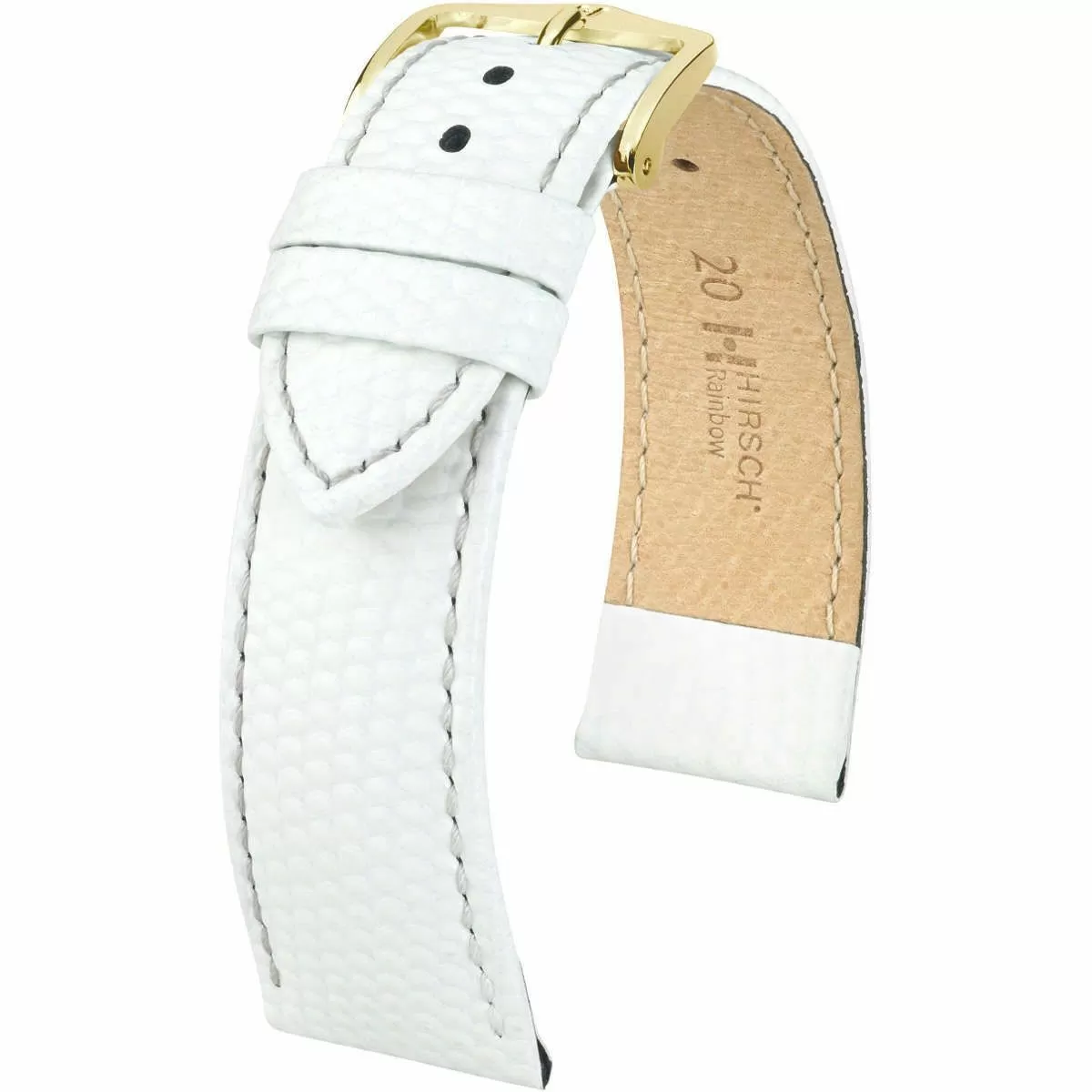 Klasyczny biały pasek skórzany z lini HIRSCH Exotic embossed leather to ponadczasowo elegancki pasek któryjest świetnym akcesorium do klasycznych zegarków. Wykonany ręcznie z najlepszej skóry cielęcej  z jedwabistym połyskiem i naturalnie wyglądającymi tłoczeniami łuski jaszczurki w półmatowym dwutonowym wykończeniu. Rozmiar 16 mm, klamerka w kolorze złotym, ceniona austriacka marka Hirsch. Rainbow jako model należy do lini Hirsch softglove lining leather. Delikatne przeszycia w kolorze paska podkreślają elegancki charakter i dodają trwałości.