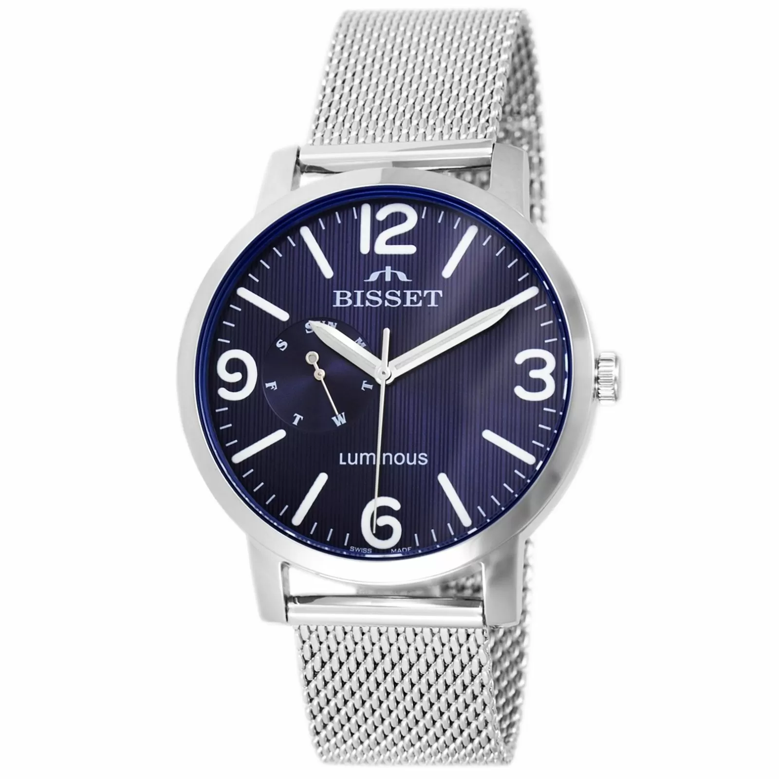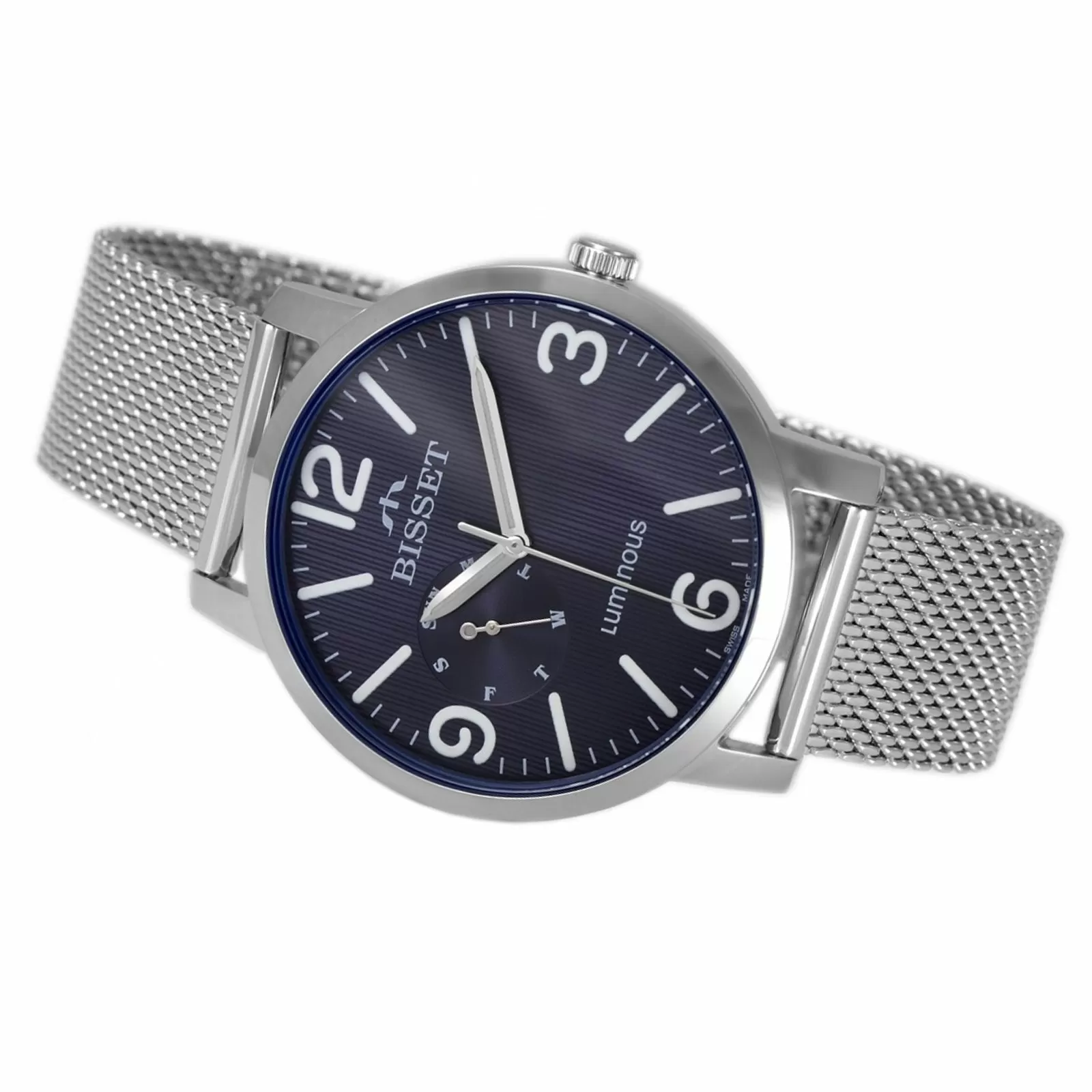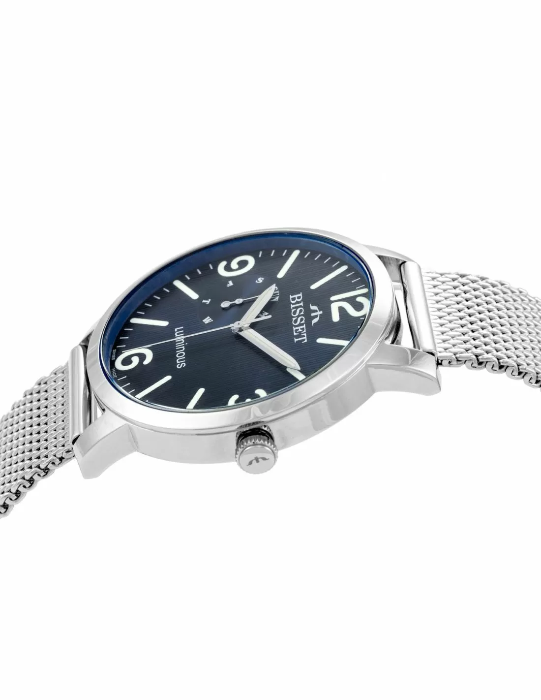 Zegarek Szwajcarski BSDE72SMDX03AX to idealny wybór dla mężczyzn, którzy poszukują eleganckiego zegarka dobrej jakości; utrzymany w kolorze srebrnym na pewno wpasować będzie mógł się w wiele sytuacji! Bisset BSDE72SMDX03AX posiada granatową tarczę, na której pełne godziny oznaczone zostały przez jasne indeksy i cyfry arabskie, co zdecydowanie poprawia czytelność zegarka. Tarczę otacza srebrna koperta i stalowa srebrna bransoleta typu mesh. Zegarek BSDE72SMDX03AX na spotkaniach właściciela na pewno zrobi wrażenie!
