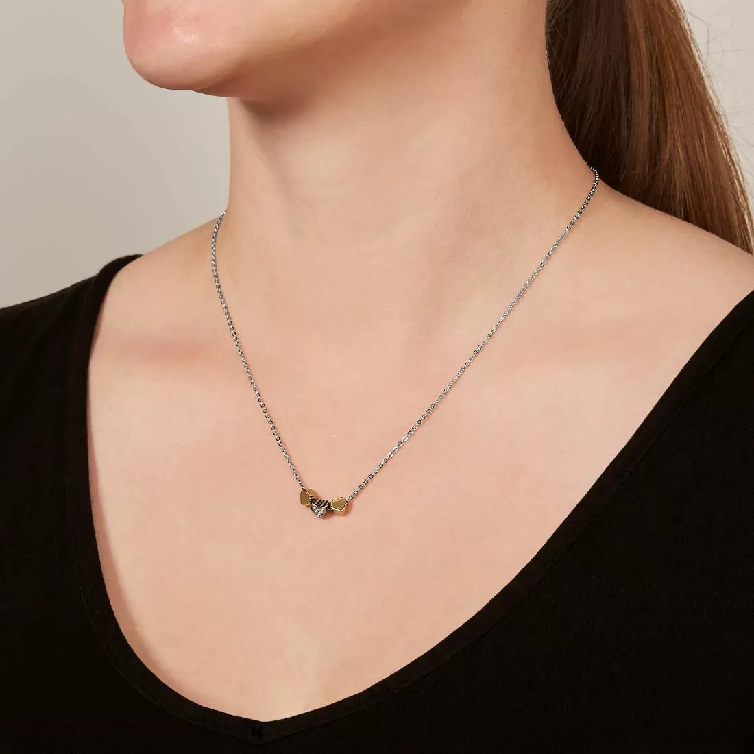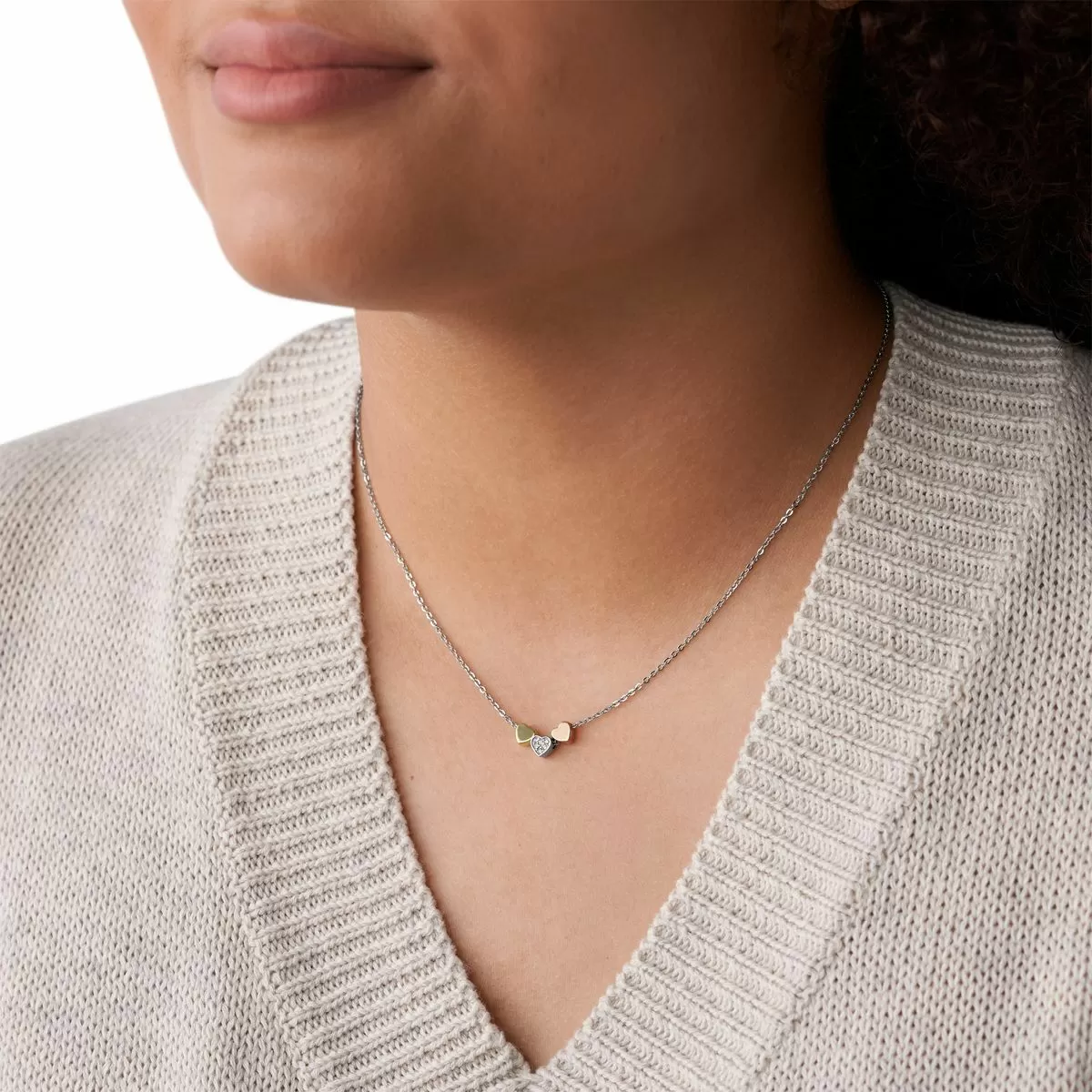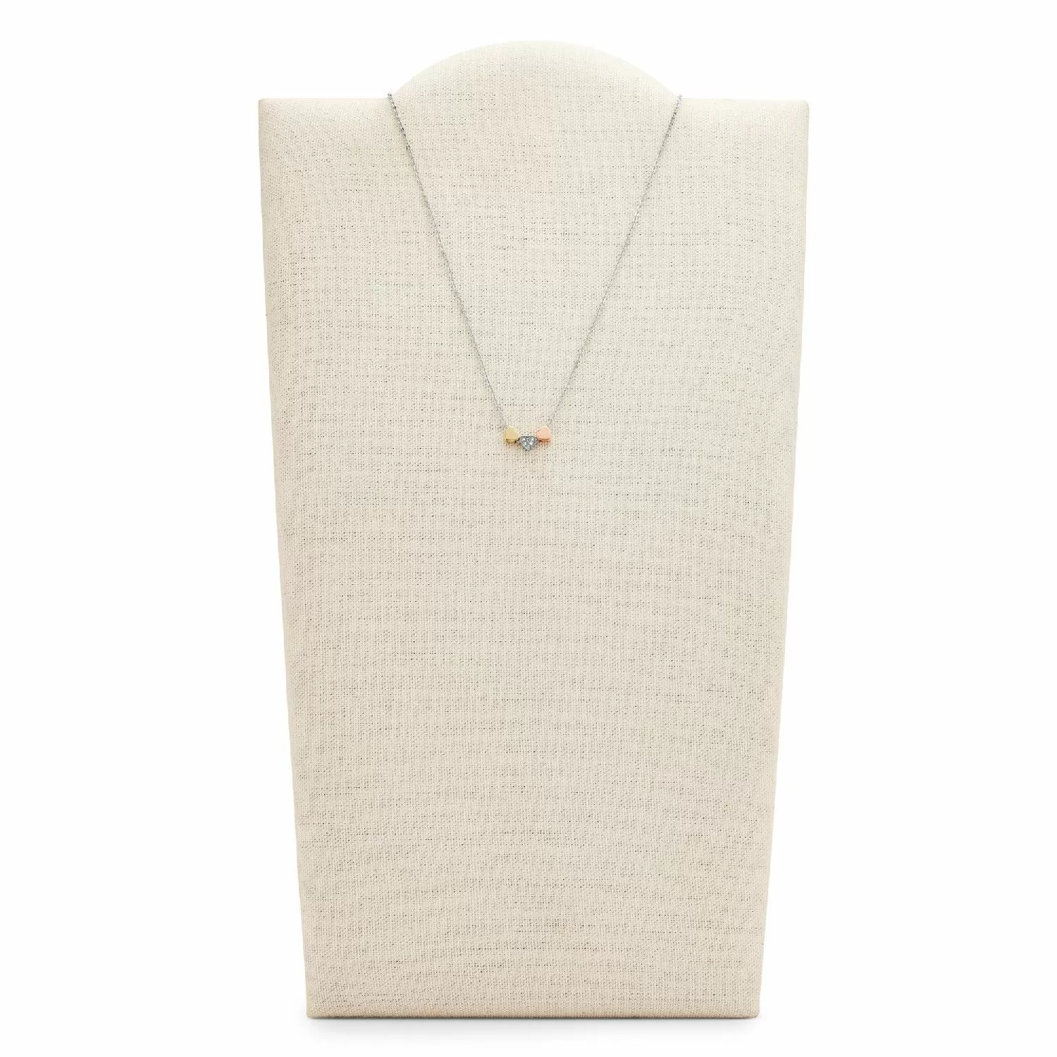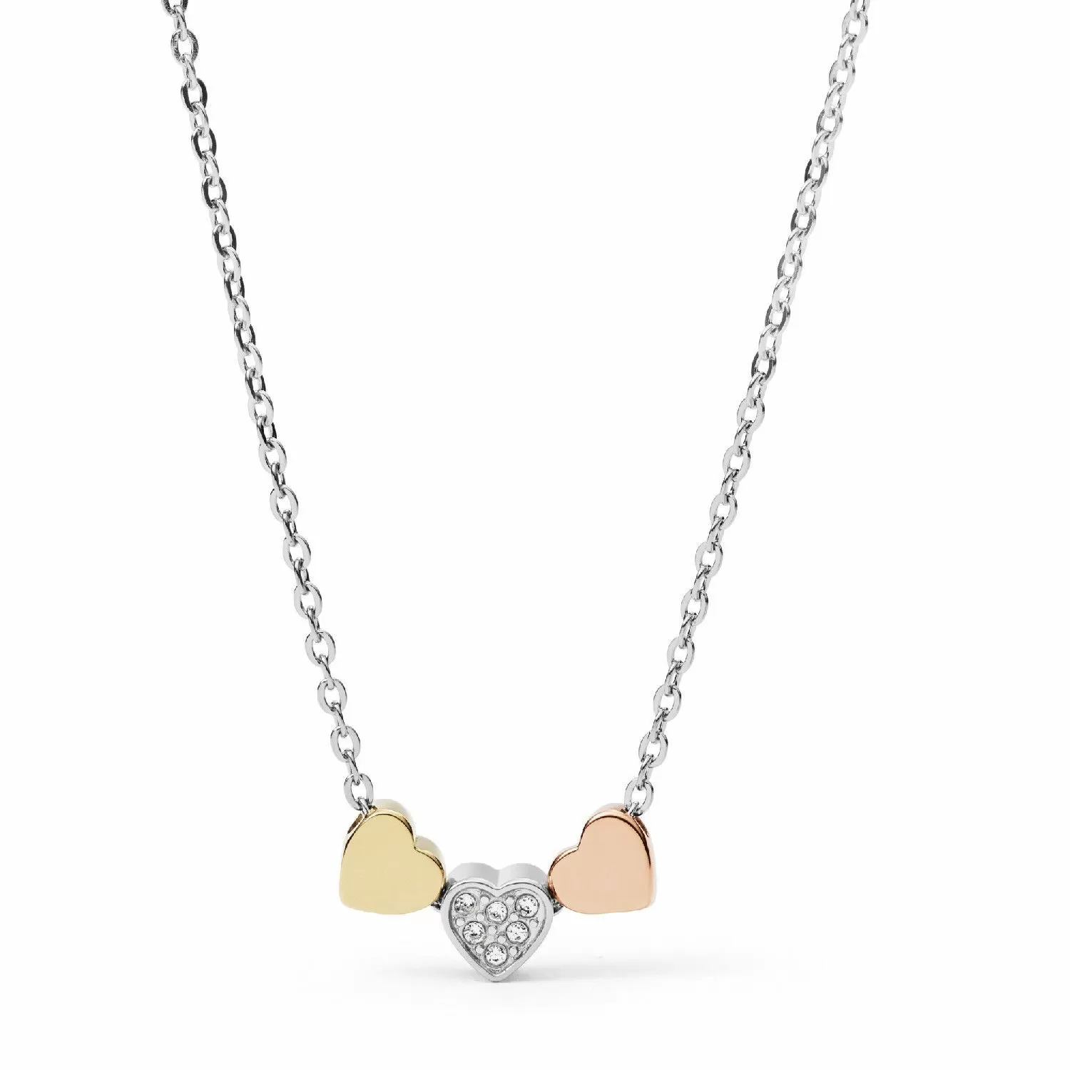 Naszyjnik Fossil JF02856998 to wyjątkowy dodatek, który podkreśli styl każdej Pani. Biżuteria damska Fossil zaprojektowana została w oparciu o najbardziej aktualne trendy, a kolorystyka utrzymana w odcieniu srebra, złota i różowego złota rewelacyjnie pasuje na każdy sezon. Komfortowe użytkowanie i trwałość zapewnia wykonanie z wysokiej jakości stali i błyszczących kryształków. Całość prezentuje się niezwykle modnie, dzięki designerskiemu wzornictwu. Prezentowany naszyjnik damski Fossil JF02856998 składa się z łańcuszka o splocie typu ankier, na którym zamocowano w centralnej części trzy zawieszki w kształcie serc - srebrną, złotą i różowo-złotą.
