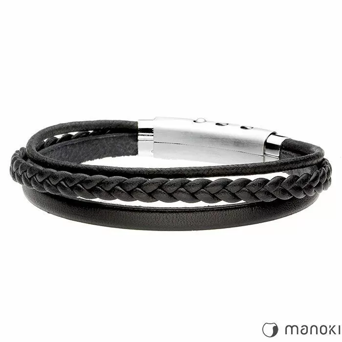 Bransoletka męska Manoki o symbolu BA359B złożona jest z trzech elementów - bawełnianego sznurka, rzemienia o plecionym designie oraz prostego rzemienia w czarnym kolorze, oplatanych na nadgarstku, połączonych bezpiecznym stalowym zapięciem. To modny dodatek dla mężczyzn, którzy lubią wyróżniać się z tłumu, a dobrane dodatki są uzupełnieniem każdej stylizacji. Wyrafinowany design, jaki charakteryzuje ten męski dodatek, przejawia się w nowoczesnym projekcie, wykonanym z dbałością o najmniejsze detale. Czarno-srebrna kolorystyka prezentuje się nienagannie, stylowo i elegancko.