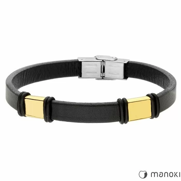 Bransoletka męska Manoki o symbolu BA693G to elegancka bransoletka dla Panów ze skóry naturalnej w kolorze czarnym z elementami w kolorze złotym. Złoty kolor elementów ozdobnych został uzyskany dzięki zastosowaniu technologii PVD. To modny dodatek dla mężczyzn, którzy lubią wyróżniać się z tłumu, a dobrane dodatki są uzupełnieniem każdej stylizacji. Wyrafinowany design, jaki charakteryzuje ten męski dodatek, przejawia się w nowoczesnym projekcie, wykonanym z dbałością o najmniejsze detale. Bransoletka jest doskonałym wyborem dla mężczyzn otwartych na nowe rozwiązania, odważnych, a jednocześnie ceniących prostotę.
