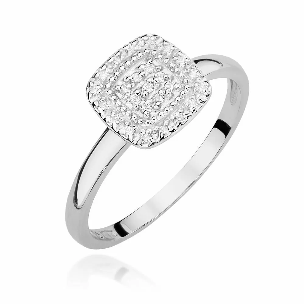 Wyjątkowy damski pierścionek z białego złota z brylantami z kwadratowym elementem. Jest to stylowy wzór, który prezentuje się bardzo elegancko i w wyrafinowany sposób podkreśla charater swojej właścicielki.