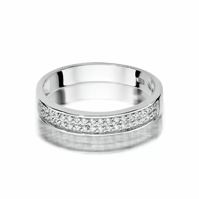Elegancka szyna wykonana została z białego złota, o próbie 585, i ma formę obrączki jednej szerokości, która w centralnej części ozdobiona podwójnym rzędem błyszczących w świetle diamentów o szlifie brylantowym, o oznaczeniu 0,18 ct H/Si.