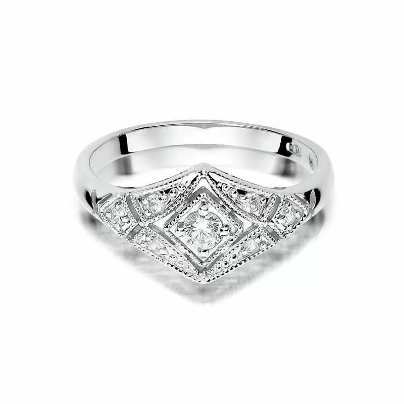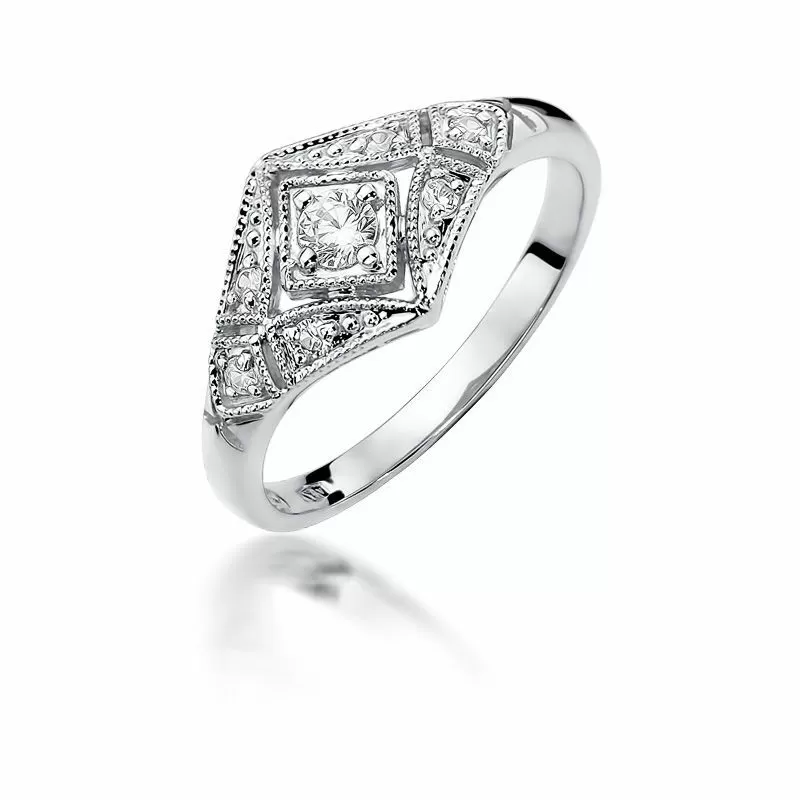Damski pierścionek z białego złota z brylantami. Jest to wyjątkowy ozdobny wzór, który prezentuje się bardzo wytwornie i zdecydowanie  podkreśla charater swojej właścicielki.