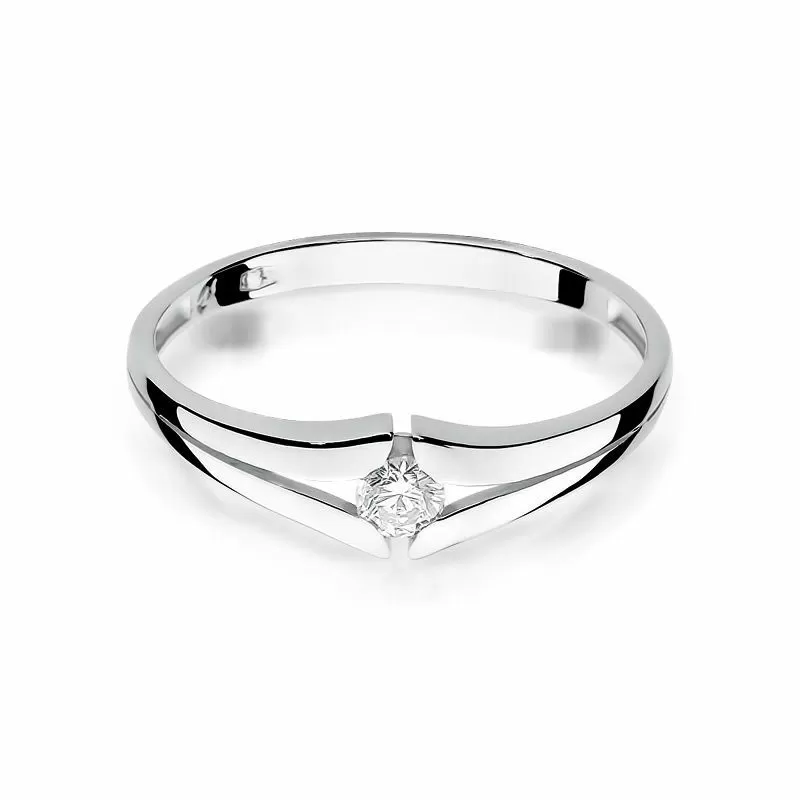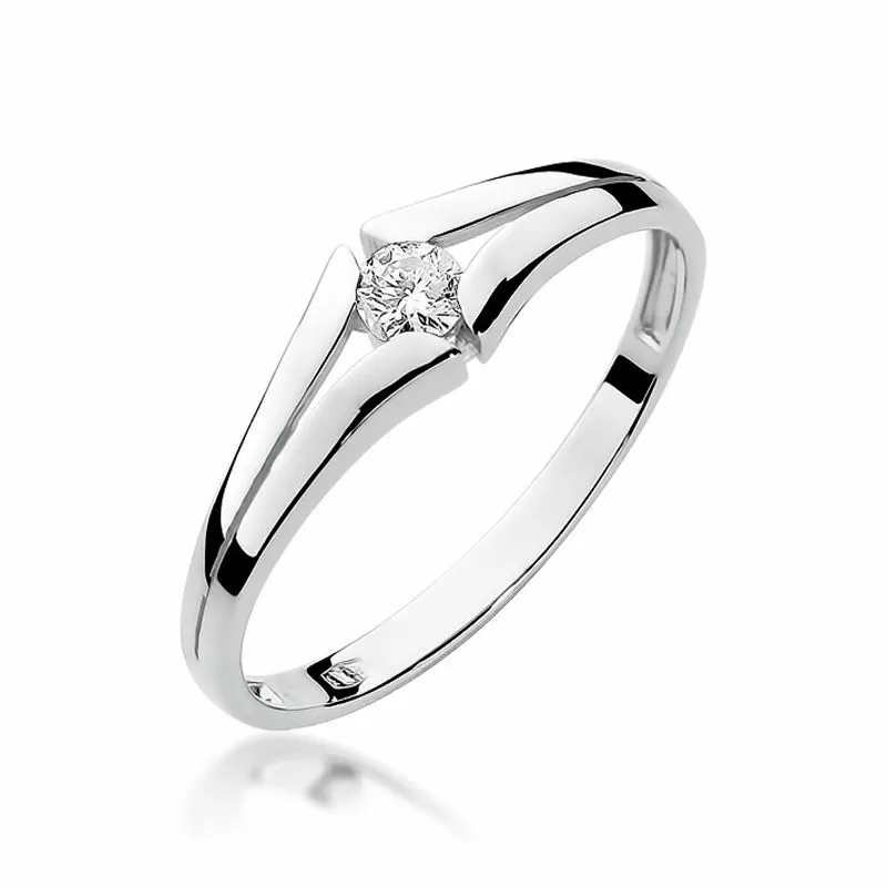 Elegancki pierścionek z białego złota z brylantem. Jest to ponadczasowy klasyczny wzór, który prezentuje się bardzo wytwornie i subtelnie podkreśla charater swojej właścicielki.