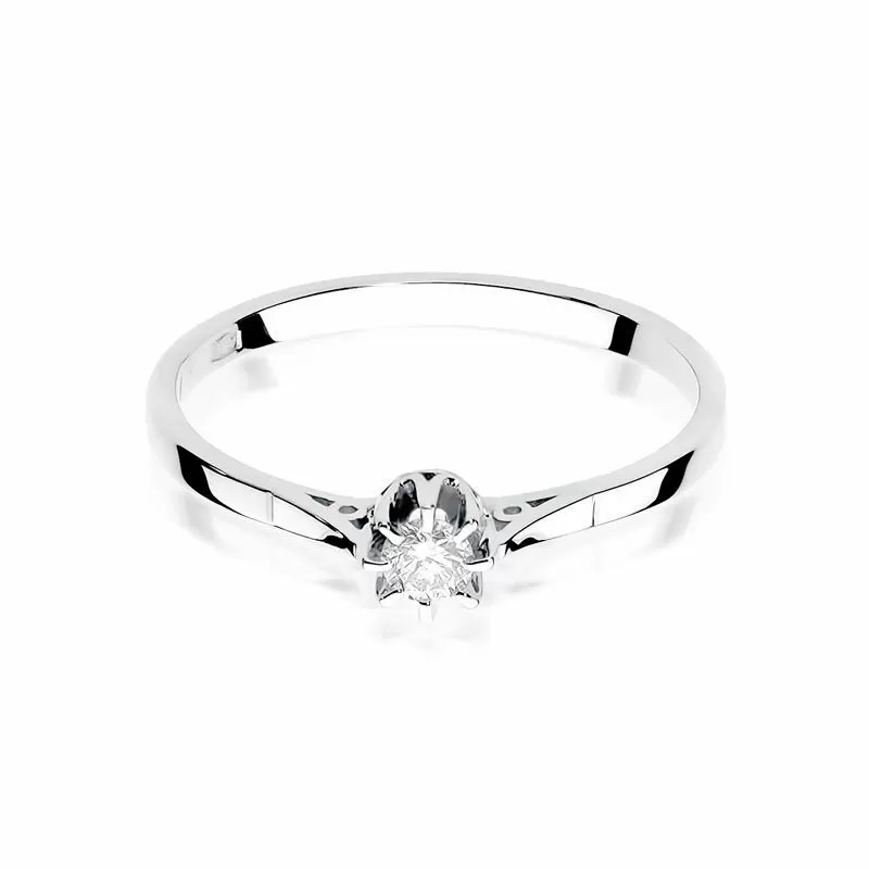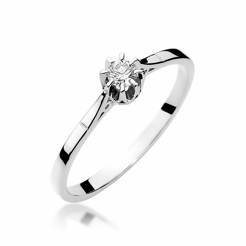 Piękny damski pierścionek z białego złota z brylantem. Jest to ponadczasowy klasyczny wzór, który prezentuje się bardzo wytwornie i subtelnie podkreśla charater swojej właścicielki.