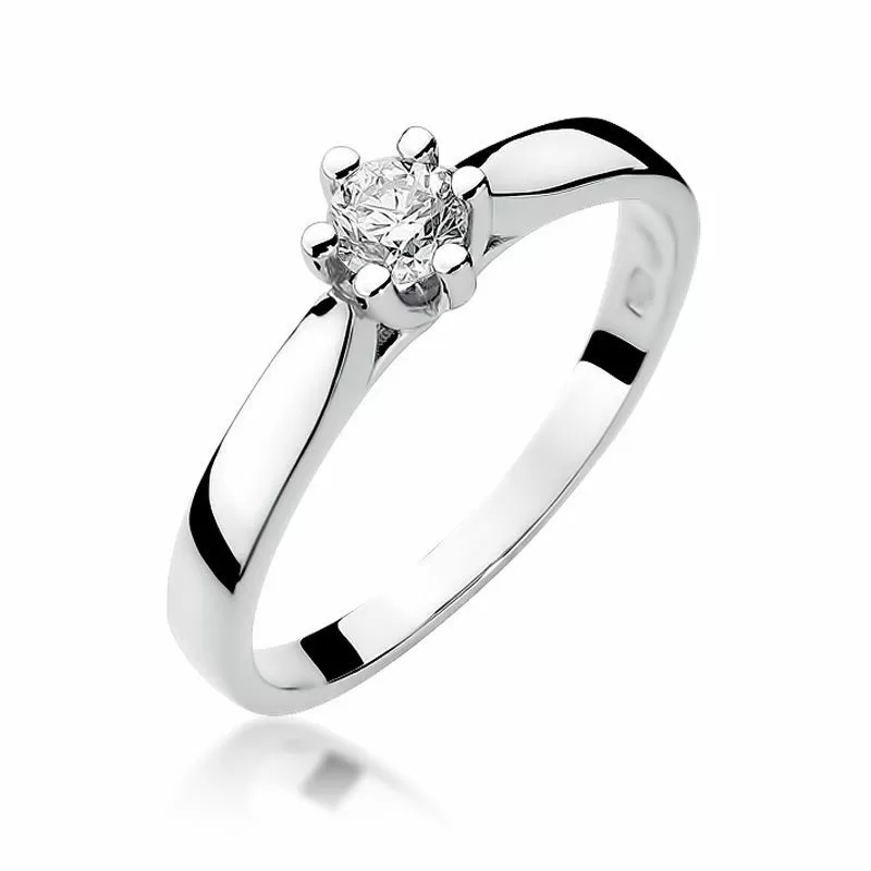Piękny pierścionek z białego złota z brylantem. Jest to ponadczasowy klasyczny wzór, który prezentuje się bardzo elegancko i subtelnie podkreśla charater swojej właścicielki.