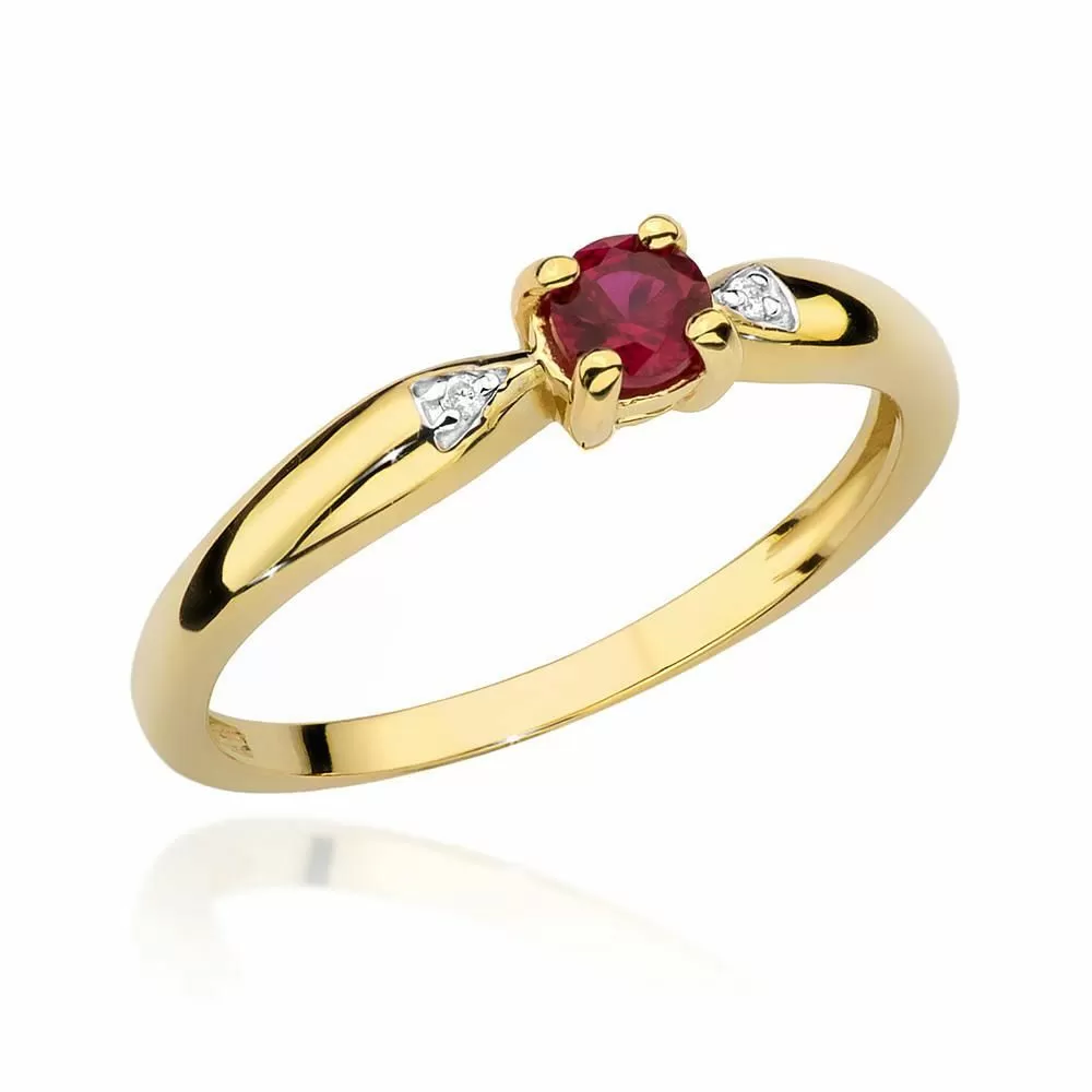 Elegancki pierscionek wykonany został z żółtego złota, o próbie 585, w której osadzono brylanty o oznaczeniu 0,01 ct H/Si i rubin o oznaczeniu 0,15ct.