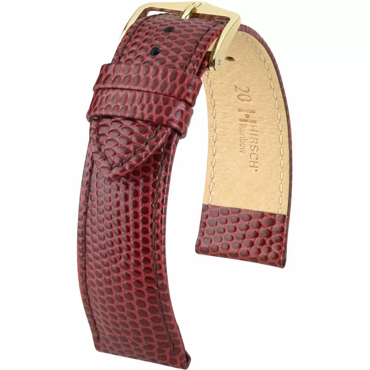 Klasyczny bordowy pasek skórzany z lini HIRSCH Exotic embossed leather to ponadczasowo elegancki pasek któryjest świetnym akcesorium do klasycznych zegarków. Wykonany ręcznie z najlepszej skóry cielęcej  z jedwabistym połyskiem i naturalnie wyglądającymi tłoczeniami łuski jaszczurki w półmatowym dwutonowym wykończeniu. Rozmiar 18 mm, klamerka w kolorze złotym, ceniona austriacka marka Hirsch. Rainbow jako model należy do lini Hirsch softglove lining leatherDelikatne przeszycia w kolorze paska podkreślają elegancki charakter i dodają trwałości.