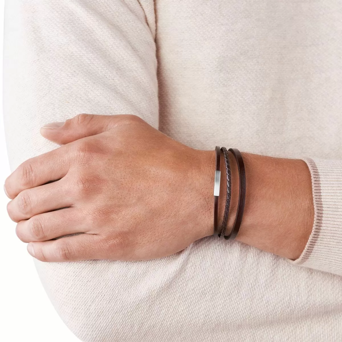 Męska bransoletka Fossil JF03323040 o bardzo modnym wyglądzie. Trzy paski, dwa skórzane i jeden skórzany ze stalowym eleentem ozdobnym, spięte stalowym zapięciem z możliwością wyboru dwóch rozmiarów obwodu. To idealny przykład biżuterii o modnym i nowoczesnym charakterze, nawiązującej delikatnie do stylu vintage. Biżuteria Fossil to część kolekcji oferowanej przez jedną z najbardziej znanych amerykańskich marek, która kieruje swoje produkty dla zarówno kobiet, jak i mężczyzn w każdym wieku.