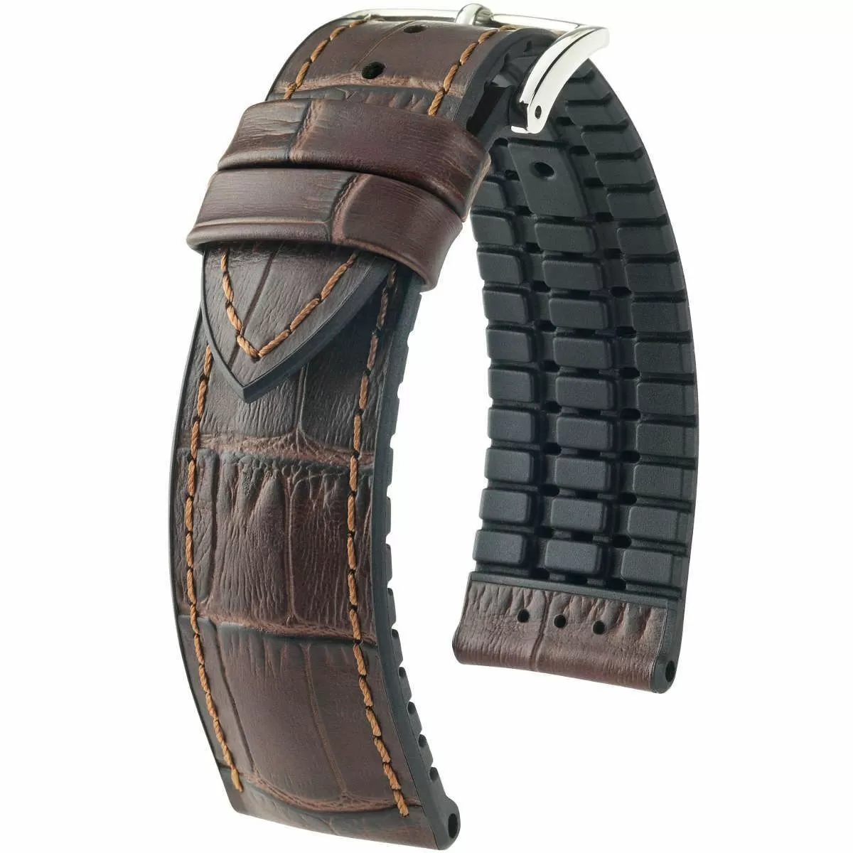 Sportowo klasyczny brązowo-czarny pasek skórzany z lini HIRSCH Performance to pasek który jest nadal świeży; ponadczasowy, z klasą, niezawodny dla dzisiejszego mężczyzny ceniącego klasykę. Wykonany ręcznie z najlepszej włoskiej skóry cielęcej z zaawansowaną odporną na zarysowania powierzchnią z naturalnie wyglądającymi tłoczeniami łuski aligatora w półmatowym dwutonowym wykończeniu która obleczona jest na rdzeniu z wysokogatunkowego kauczuku uformowanego w taki sposób aby umożliwiał wentylację. Rozmiar 18 mm, klamerka w kolorze srebrnym, ceniona austriacka marka Hirsch. Paul jako model należy do lini Hirsch Alligator embossed jest też wodoszczelny i testowany w saunie. Przeszycia w kolorze paska dodają mu uniwersalnego charakteru i trwałości.