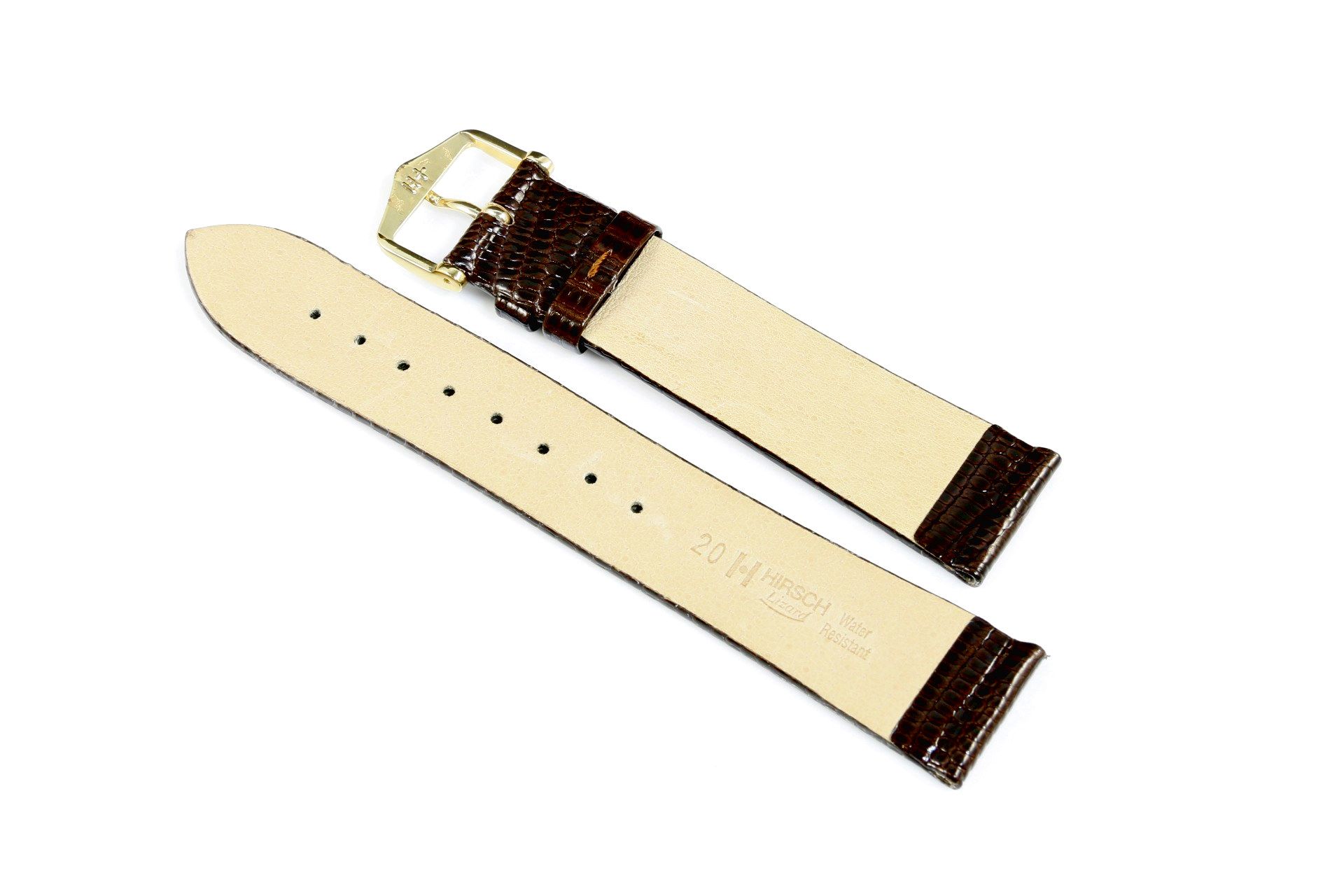 Luksusowy brązowy pasek skórzany z lini HIRSCH Velvet Glove lining leather wykonany z pierwszorzędnej skóry jaszczurki o strukturze gęstej łuski , polerowanej ręcznie dla brylantowego połysku Rozmiar 12 mm, klamerka w kolorze złotym , ceniona austriacka marka Hirsch. Lizard jako model  należy do rodziny produktów Precious leather. Bezpretensjonalny ksztalt , luksusowy wyraz to główne cechy tego wyjątkowego płaskiego paska który został  wykonany ręcznie , Będzie pasował do każdego eleganckiego zegarka. Model wykonany jest z miękkiej skóry i rewelacyjnie sprawdzi się jako dodatek do zegarka na każdy dzień  jak i na specjalną okazję.