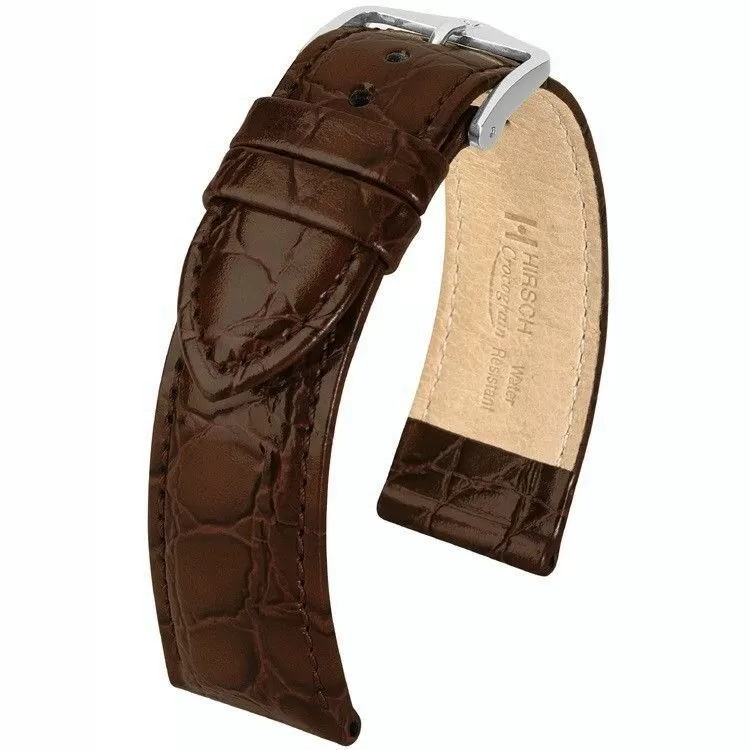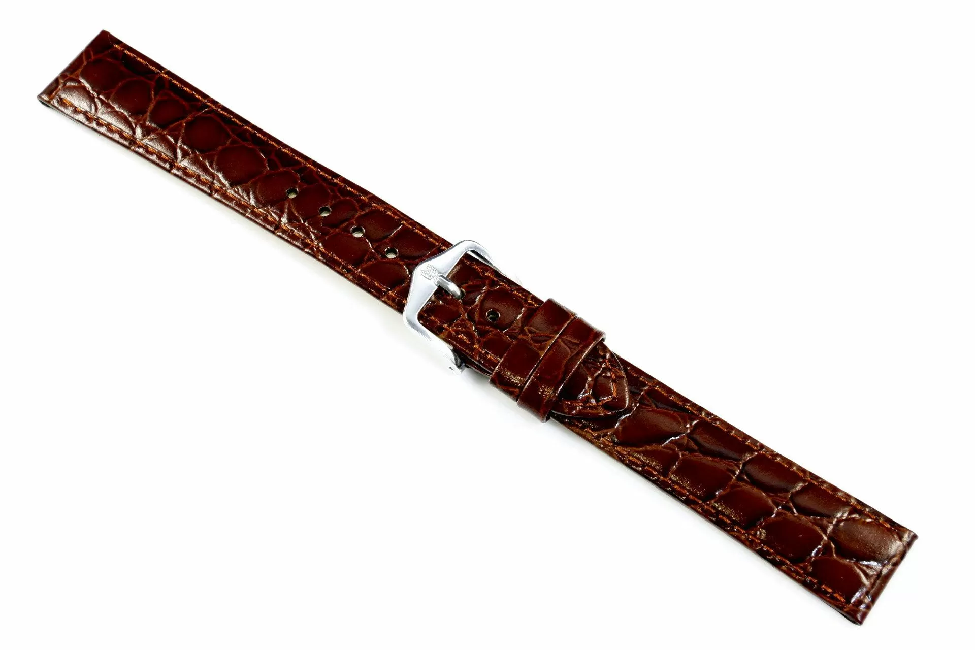 Elegancki brązowy pasek skórzany z lini HIRSCH Exotic embosed leather przekonuje dyskretny designem i specjalnym połyskiem dodającym eleganckiego akcentu. Wykonany ręcznie z najlepszej połyskującej skóry cielęcej  z naturalnie wyglądającymi tłoczeniami łuski aligatora w półmatowym dwutonowym wykończeniu. Rozmiar 18 mm, klamerka w kolorze srebrnym, ceniona austriacka marka Hirsch. Crocogain jako model należy do lini HirschSoftglove leather. Przeszycia w kolorze paska sprawiają ,że jest harmonijny i trwały.