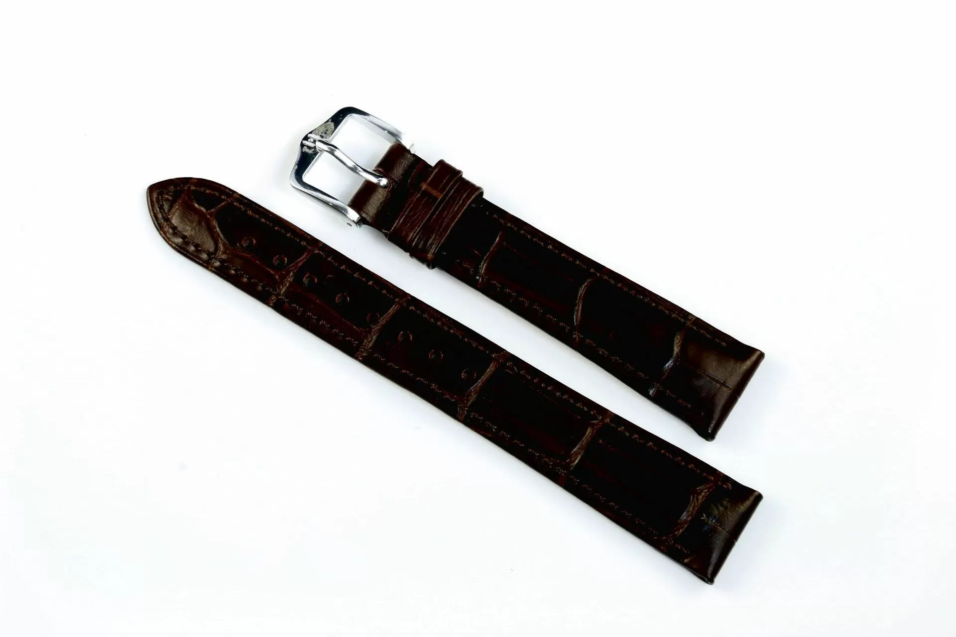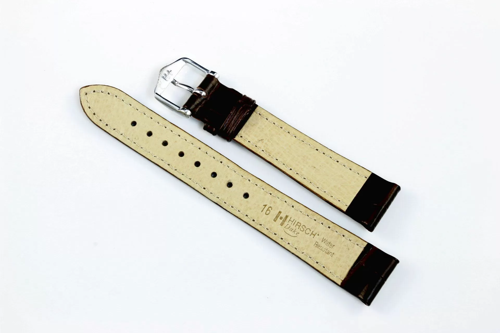Unikalny brązowy pasek skórzany z lini Hirsch Alligator embossed wykonany najlepszej  włoskiej skóry cielęcej . Z naturalnie wyglądającą półbłyszczącą w dwóch tonach powierzchnią ze specjalnym przetłoczeniem oddającym rzeczywistą strukturę skóry Aligatora z Luisiany w prostokąne łuski. Rozmiar 18 mm, klamerka w kolorze złoty, ceniona austriacka marka Hirsch. DUKE jako model  należy do rodziny produktów Exotic embossed leather. Niesamowity kształt, luksusowy wyraz, piękny pasek skórzany wykonany ręcznie do eleganckich zegarków. Pasek z pierwszorzędnej,miękkiej i wygodnej włoskiej skóry cielęcej rewelacyjnie sprawdzi się jako dodatek do zegarka na codzień. Dla trwałości i wzmocnienia pasek został przeszyty nicią w kolorze paska, nadając mu tym samym unikatowego charakteru i żywotności.
