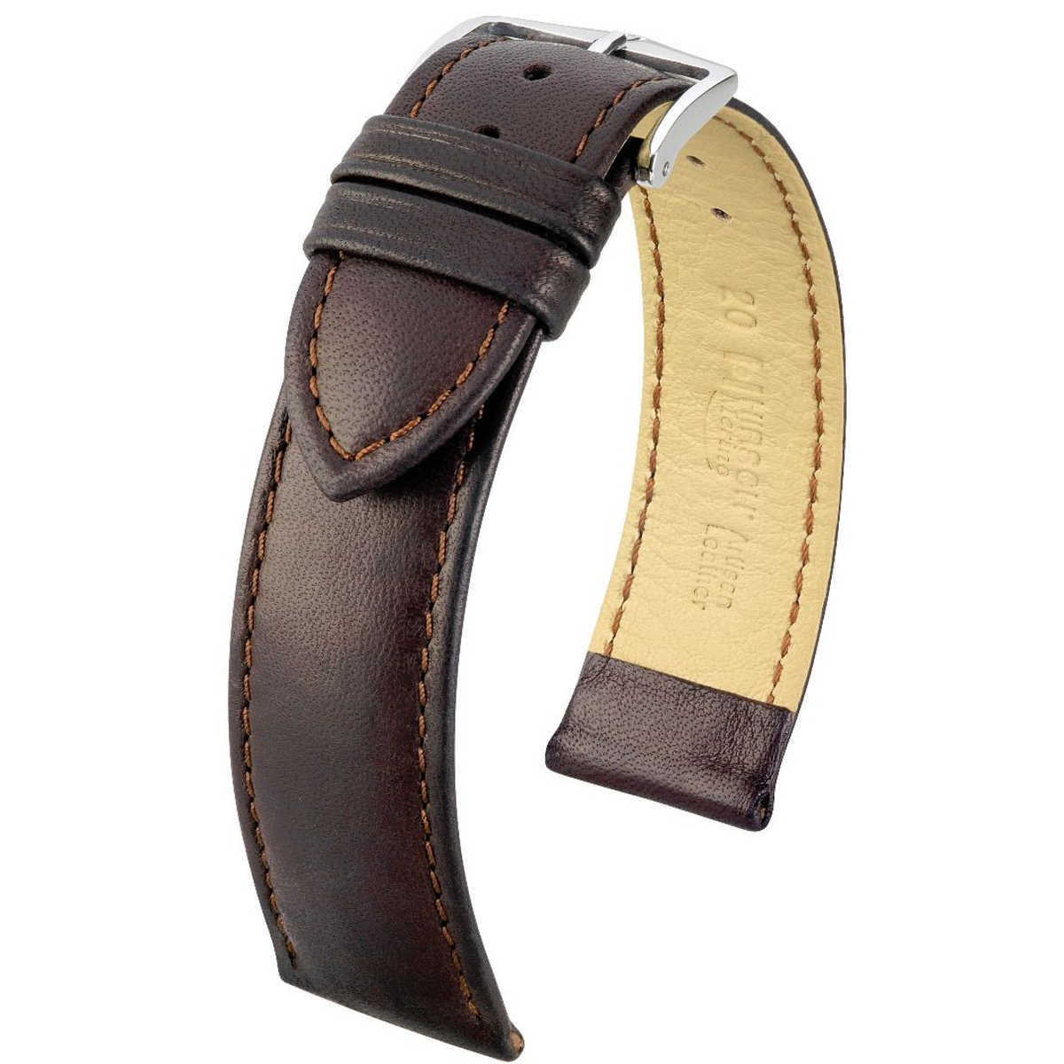 Wyjątkowy brązowy pasek skórzany z lini Hirsch Artisan Leather wykonany z francuskiej skóry owczej nappa . Tradycyjne barwionej  w beczce o niezwykle miękkiej w powierzchni w dotyku przypominającej jedwab . Rozmiar 22 mm, klamerka w kolorze srebrnym, ceniona austriacka marka Hirsch. Merino jako model  należy do rodziny produktów Unstruktured leather. Klasycznie elegancki kształt, luksusowy wyraz, piękny pasek skórzany z perłowym połyskiem wykonany ręcznie do eleganckich zegarków. Model ten z pierwszorzędnej, miękkiej i delikatnej francuskiej skóry owczej rewelacyjnie sprawdzi się jako dodatek do zegarka na każdy dzień . Dla trwałości i wzmocnienia pasek został przeszyty nicią w kolorze paska, nadając mu tym samym wyraźnego charakteru i żywotności.