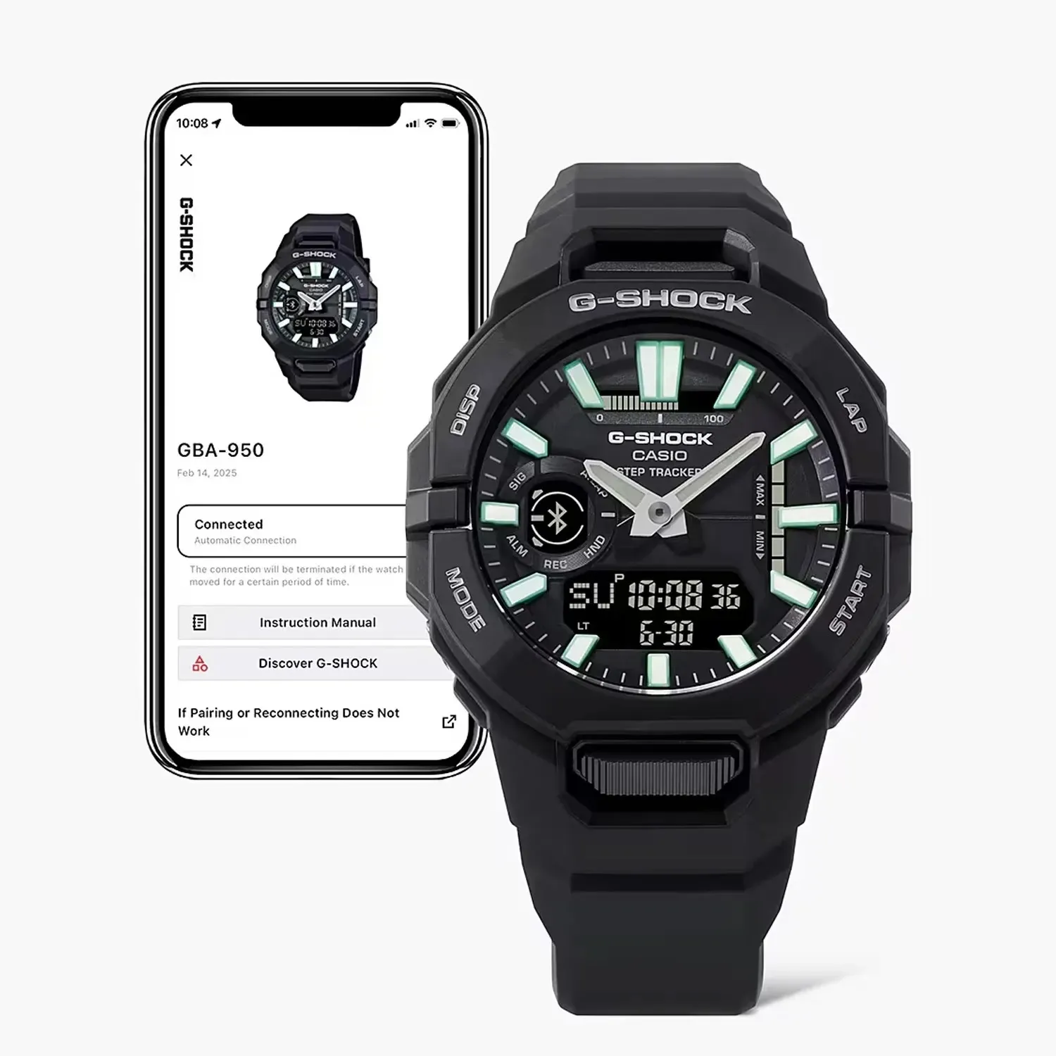 GBA-950 to wielofunkcyjny zegarek treningowy, który doskonale wpisuje się w rytm współczesnego stylu życia. Dzięki technologii Bluetooth i integracji z aplikacją CASIO WATCHES umożliwia śledzenie aktywności fizycznej, precyzyjne ustawienia czasu oraz powiadomienia z telefonu. A wszystko to w połączeniu z legendarną odpornością G-SHOCK i nowoczesnym designem, który przyciąga spojrzenia.