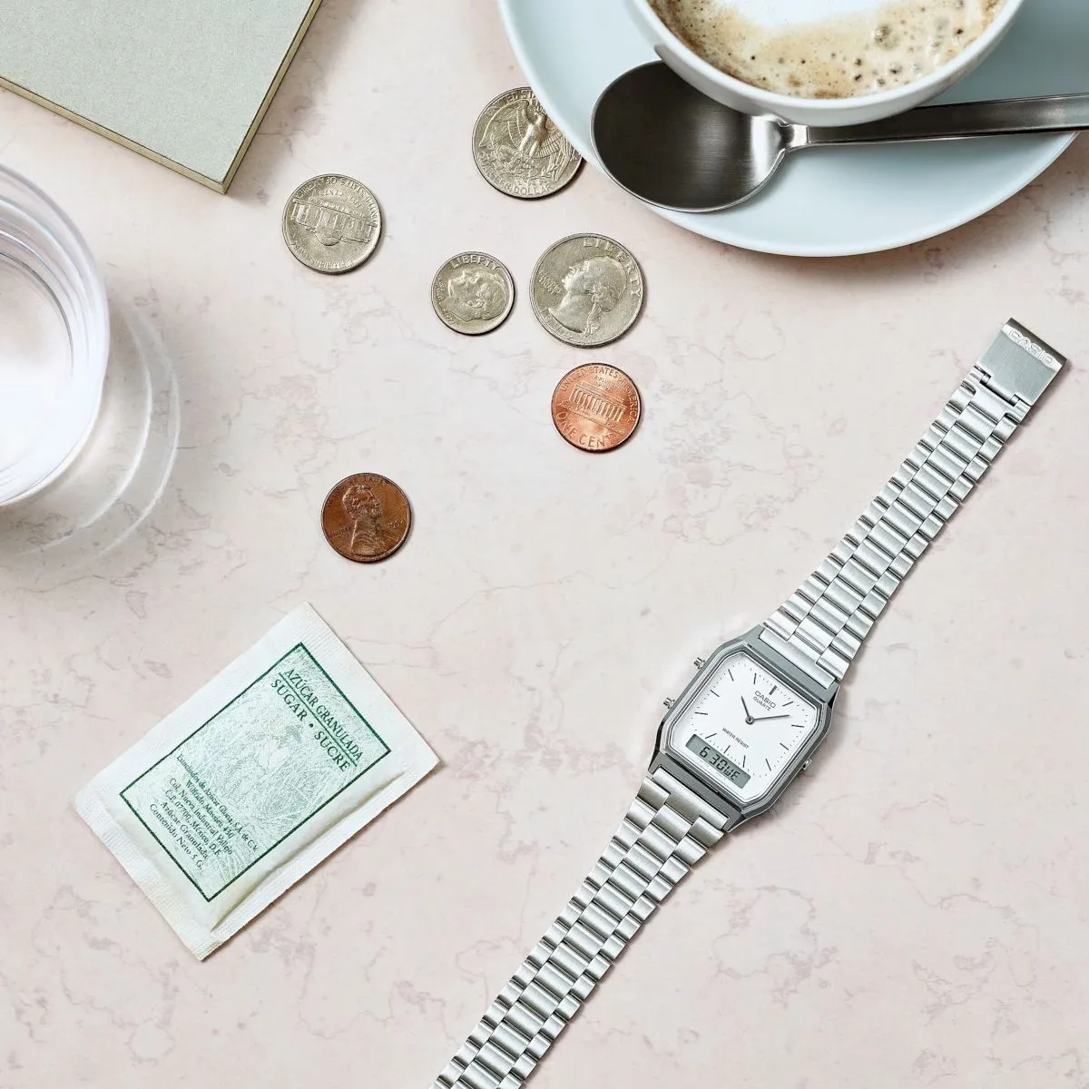 Casio Vintage srebrny zegarek w stylu retro z wyświetlaczem i wskazówkami AQ-230A-7DMQYES
