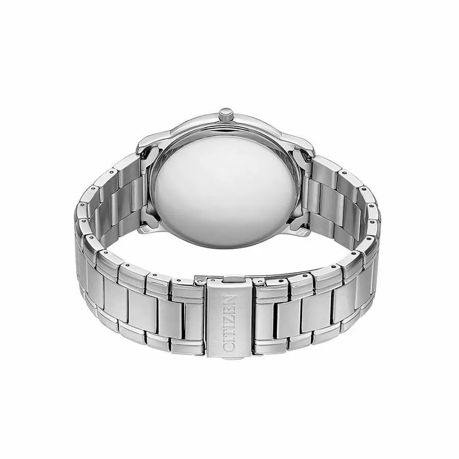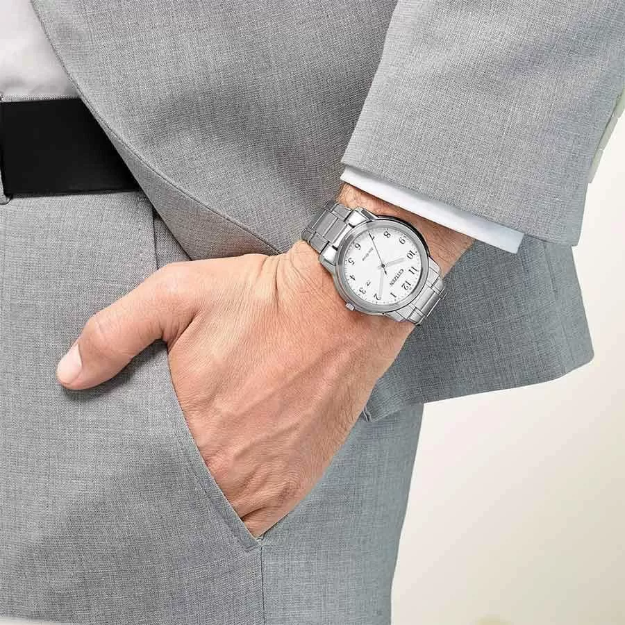 Zegarek Citizen AW1211-80A to klasyczny męski model, z cyframi arabskimi na pełnych godzinach, w ponadczasowym designie, o srebrno-białejkolorystyce, ze stalową bransoletką, który posiada funkcję datownika. Ponadczasowy charakter zegarka Citizen Classic AW1211-80A przejawia się w praktycznej funkcjonalności, natomiast elegancki wygląd czasomierza bez wątpienia doda stylu i szyku każdej kreacji. Koperta została wykonana ze stali szlachetnej, o srebrnym wykończeniu, co doskonale współgra z białą tarczą, na której za pomocą  arabskich cyfr oznakowane zostały pełne godziny. Do niej dopasowano prostą bransoletkę ze stali szlachetnej. Wewnątrz koperty został osadzony kwarcowy mechanizm, który napędzany jest przez baterię. Z tarczy poza wskazaniem aktualnej godziny można również odczytać jaki jest bieżący dzień miesiąca, kórego wskazanie zilustrowane zostało w okienku tuż obok miejsca wskazania godziny trzeciej. Kopertę zegarka Citizen AW1211-80A zamyka szkiełko mineralne, bardzo dobrze sprawdzające się w codziennym użytkowaniu. Model ten posiada 5ATM wodoszczelności, które umożliwia powierzchniowe zanurzenie w wodzie.
