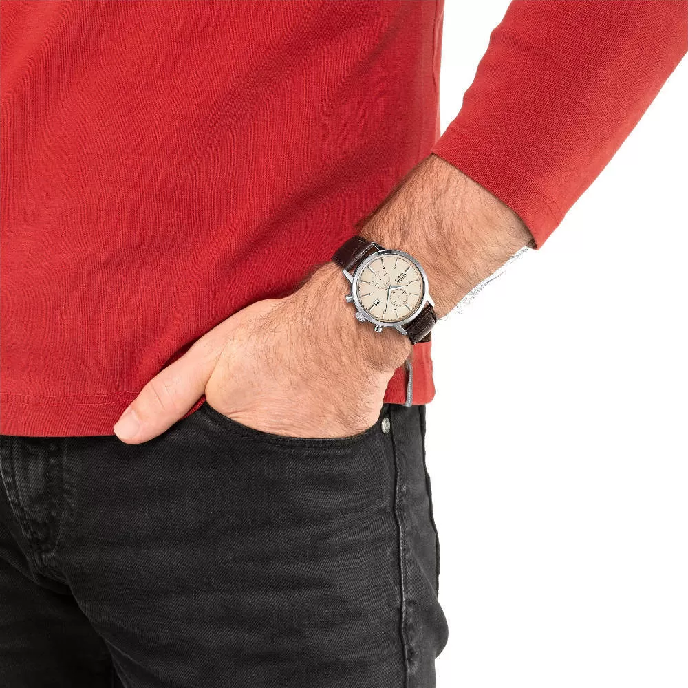 Zegarek Citizen CA7061-26X to klasyczny męski model z funkcją chronografu, który posiada beżową tarczą, w ponadczasowym designie, o srebrnej kolorystyce, z paskiem i kopertą wykonaną ze stali szlachetnej. Ponadczasowy charakter zegarka Citizen Classic CA7061-26X przejawia się w praktycznej funkcjonalności, natomiast elegancki wygląd czasomierza bez wątpienia doda stylu i szyku każdej kreacji. Koperta o srebrnym wykończeniu, która doskonale współgra z beżową tarczą, na której za pomocą indeksów oznakowane zostały pełne godziny. Wewnątrz koperty został osadzony kwarcowy mechanizm, który napędzany jest przez baterię. Kopertę zegarka Citizen CA7061-26X zamyka szkiełko mineralne, bardzo dobrze sprawdzające się w codziennym użytkowaniu. Model ten posiada 10ATM wodoszczelności, które umożliwia pływanie powierzchniowe, a nawet zanurzenie w wodzie.