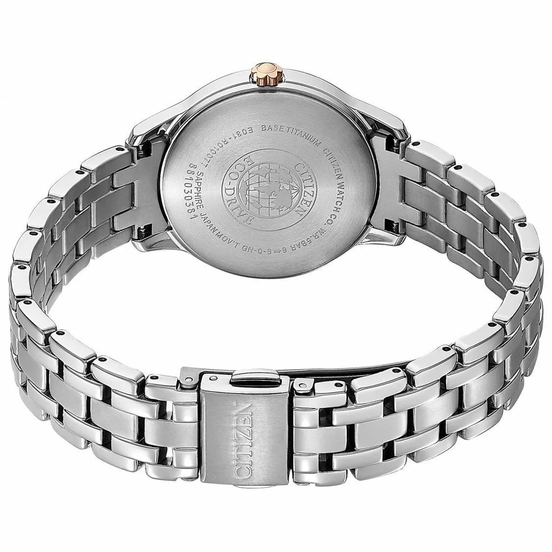 Damski zegarek Citizen Lady Eco Drive EM0726-89Y przyciąga do siebie uwagę i podziw; srebrna tytanowa bransoleta, tarcza utrzymana w wyjątkowym miętowym odcieniu i srebrna koperta z tytanu połączone w jedność tworzą dzieło sztuki na nadgarstku kobiety. Jest to także czasomierz, którego wyjątkowość polega na zastosowaniu nowoczesnej technologii zasilania polegającej na absorbowaniu przez mikrokomórkę promieni światła, które wewnątrz koperty zamieniane są na energię elektryczną która zasila działanie mechanizmu kwarcowego. Serce zegarka Citizen EM0726-89Y zostało osadzone w kopercie z tytanu, która doskonale komponuje się ze srebrną tytanową bransoletą. Tarcza zegarka z pastelowymi kolorami i srebrna koperta idealnie ze sobą współgrają. Kopertę zegarka Citizen EM0726-89Y zamyka szafirowe szkiełko, które może zapewnić dużą odporność na jakiekolwiek zarysowania. Ten zegarek, który podkreśli klasę i elegancję każdej stylizacji, to dodatek, który z pewnością powinna posiadać każda kobieta.