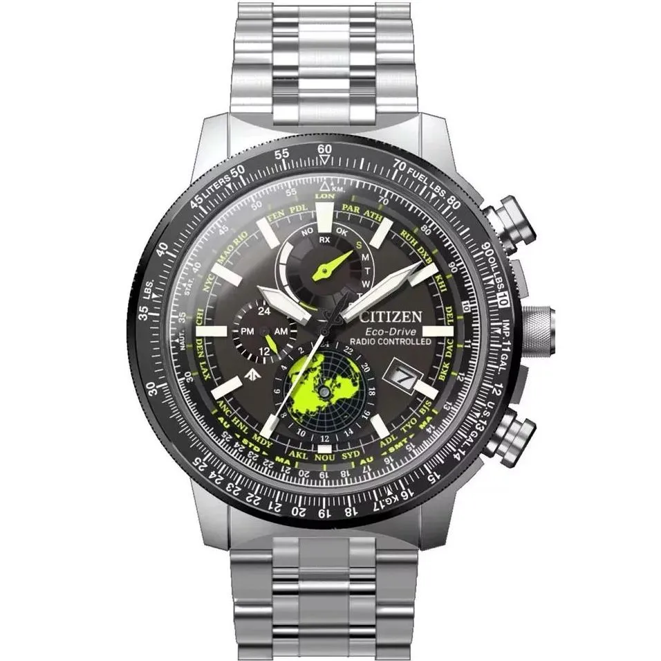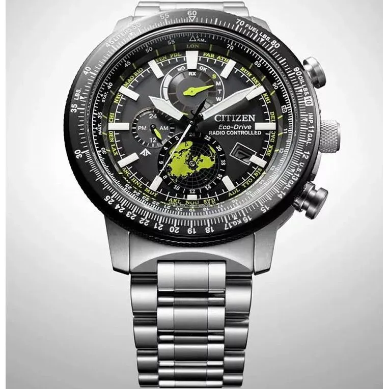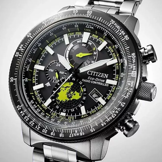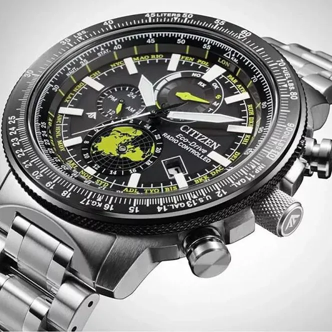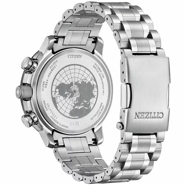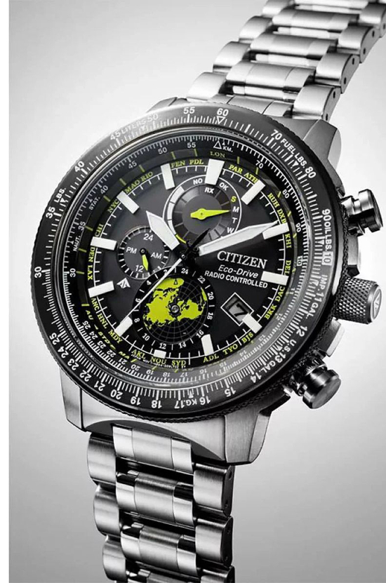 Inne standardowe i zaawansowane funkcje zegarka obejmują godziny i minuty pracy, wskazanie daty, wskazanie rezerwy chodu, czas światowy i funkcję suwaka logarytmicznego. Ten charakterystyczny zegarek sportowy wykorzystuje technologię Citizen Eco-Drive, która jest zasilana w sposób zrównoważony dowolnym światłem i nigdy nie potrzebuje baterii. Wodoodporny do 200 metrów.