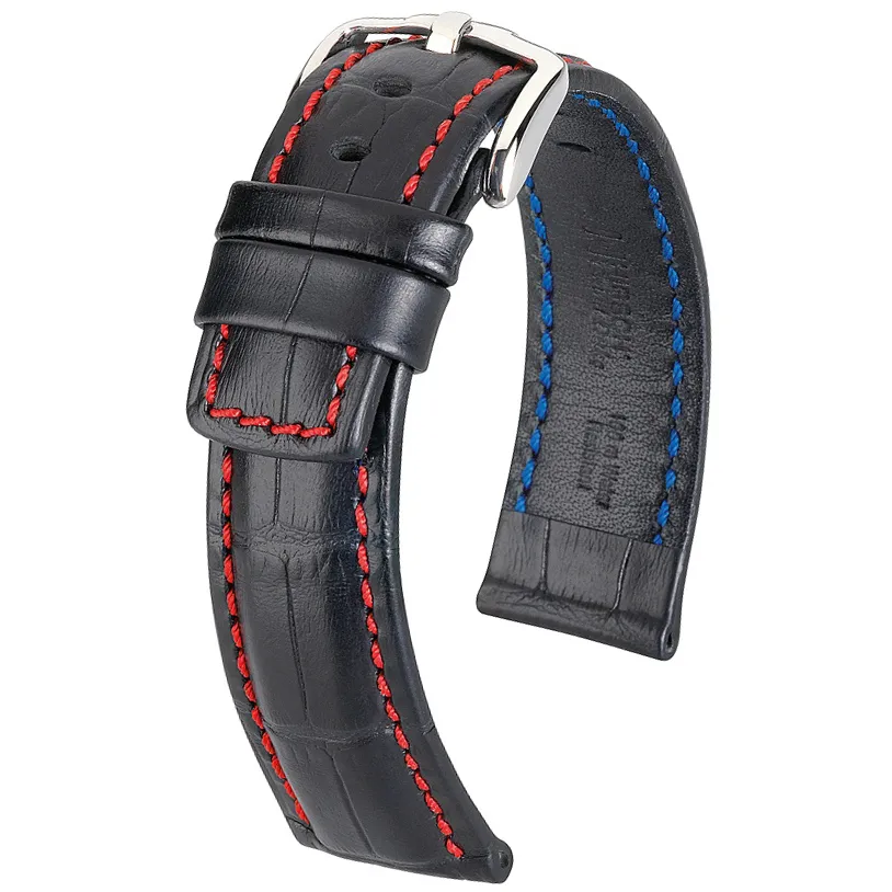 Mocny i dynamiczny czarny pasek skórzany z lini HIRSCH Diving Glove lining leather emanuje sportowym charakterem i wykonany jest z najlepszej włoskiej  skóry cielęcej . Naturalnie wyglądającej półbłyszczącej w dwóch tonach powierzchni ze specjalnym przetłoczeniem oddającym rzeczywistą strukturę skóry Aligatora z Luisiany w prostokąne łuski ,wykonany ręcznie. Rozmiar 22 mm, klamerka w kolorze srebrnym , ceniona austriacka marka Hirsch. Grand Duke jako model  należy do rodziny produktów Exotic embosed leather i Hirsch 100 m Water-Resistant co umożliwia montaż do wodoszczelnych zegarków z ktorymi można pływać a nawet nurkować. Przeszyty nicią w kolorze paska lub kontrastowym dla podkreślenia silnego charakteru.