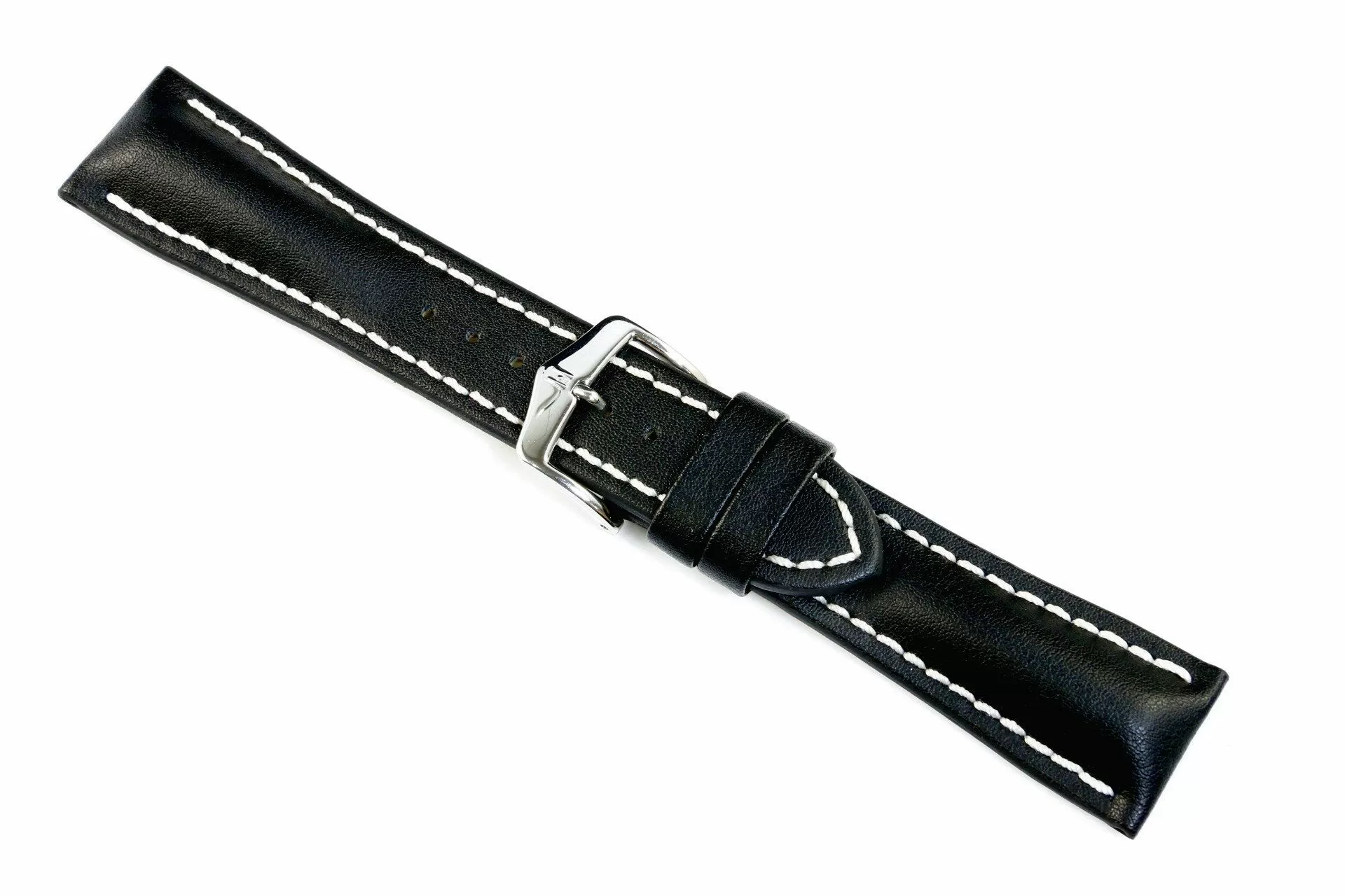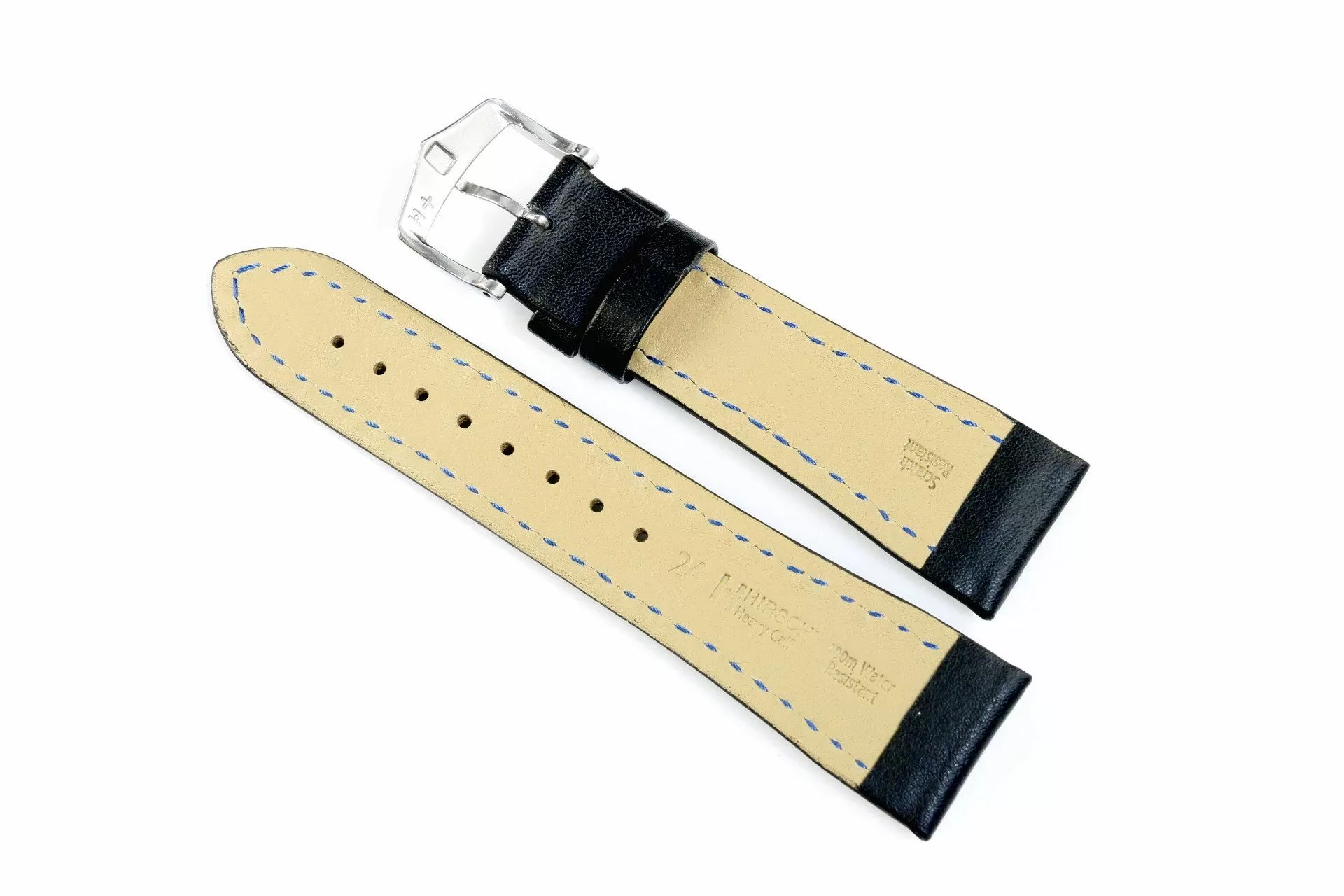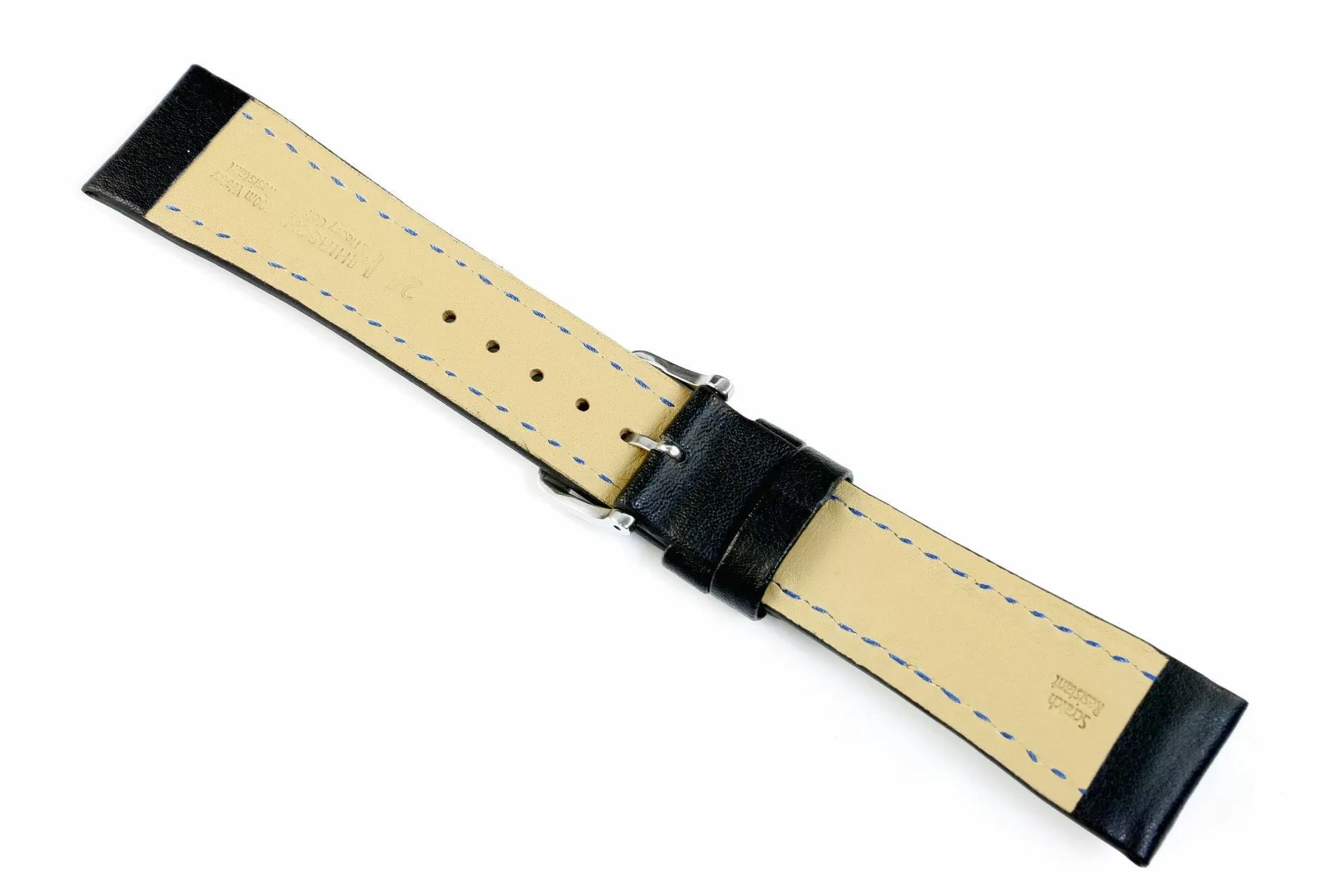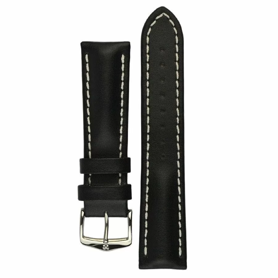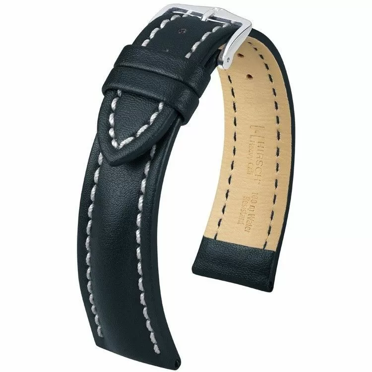Solidny czarny pasek skórzany z lini HIRSCH Scratch-Resistant  oraz HIRSCH 100m Water-Resistant wykonany z odpornej na zadrapania i wodoszczelne wloskiej skóry cielęcej  umożliwia zamontowanie go do sportowego zegarka z którym można pływać a nawet nurkować do 100 mRozmiar 22 mm, klamerka w kolorze srebrnym, ceniona austriacka marka Hirsch. Heavy Calf jako model  należy do rodziny produktów Untruktured leather. Masywne kształty, uniwersalno-sportowy wyraz, pasek skórzany wykonany ręcznie do zegarków sportowych. Model ten pomimo zdecydowanych kształtów wykonany jest miękkiej skóry i rewelacyjnie sprawdzi się jako dodatek do zegarka na każdy dzień . Dla trwałości i wzmocnienia pasek został przeszyty nicią w kontrastowym jasnym kolorze , nadano mu tym samym wyraźnego charakteru i sportowej nuty.