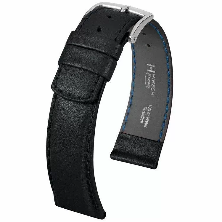Sportowy czarny pasek skórzany z lini HIRSCH Rubberlike lining leather jest inteligentnym sportowym paskiem, który czuje się jak w domu zarówno na lądzie jak i w wodzieWykonany ręcznie  z wysokiej jakości wododpornej skóry cielęcej Hirsch 100 m Water-Resistant która umożliwia uprawianie z tym paskiem i wodoszczelnym zegarkiem pływania a nawet nurkowania. Rozmiar 22 mm, klamerka w kolorze srebrnym, ceniona austriacka marka Hirsch. Runner jako model należy do rodziny produktów Unstructured leather . Delikatne przeszycie dodaje mu zdecydowanego charakteru tak ważnego dla właścicieli klasycznych zegarków.