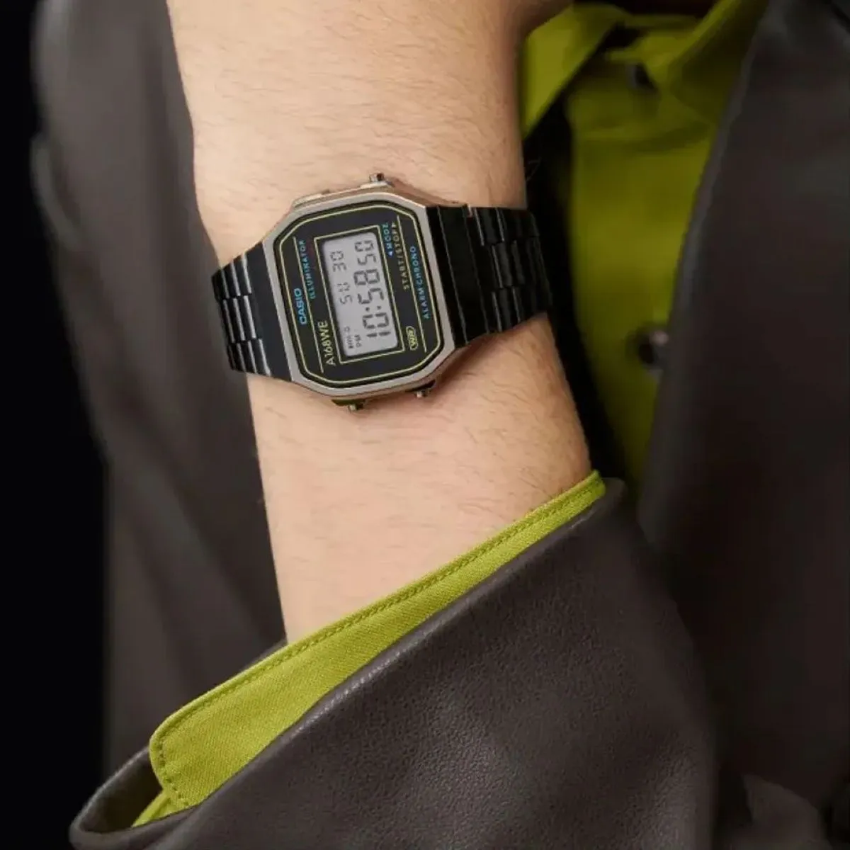 Nowa odsłona kolorystyczna zegarka Casio A168WEHB-1AEF z pewnością przypadnie do gustu  wielbicielom kolekcji Casio Retro stylizowanej według wyglądu pierwszych zegarków z wyświetlaczem. Stalowa bransoleta pokryta matową powłoką w kolorze czarnym doskonale współgra z czarnym wyświetlaczem, na którym wyświetlany jest czas w postaci jasnych cyfr. Wyświetlacz zegarka Casio A168WEHB-1AEF osadzony został w kopercie wykonanej z tworzywa sztucznego pokrytego powłoką w kolorze czarnym, która z czarnymi elementami zegarka tworzy bardzo modny kontrast.