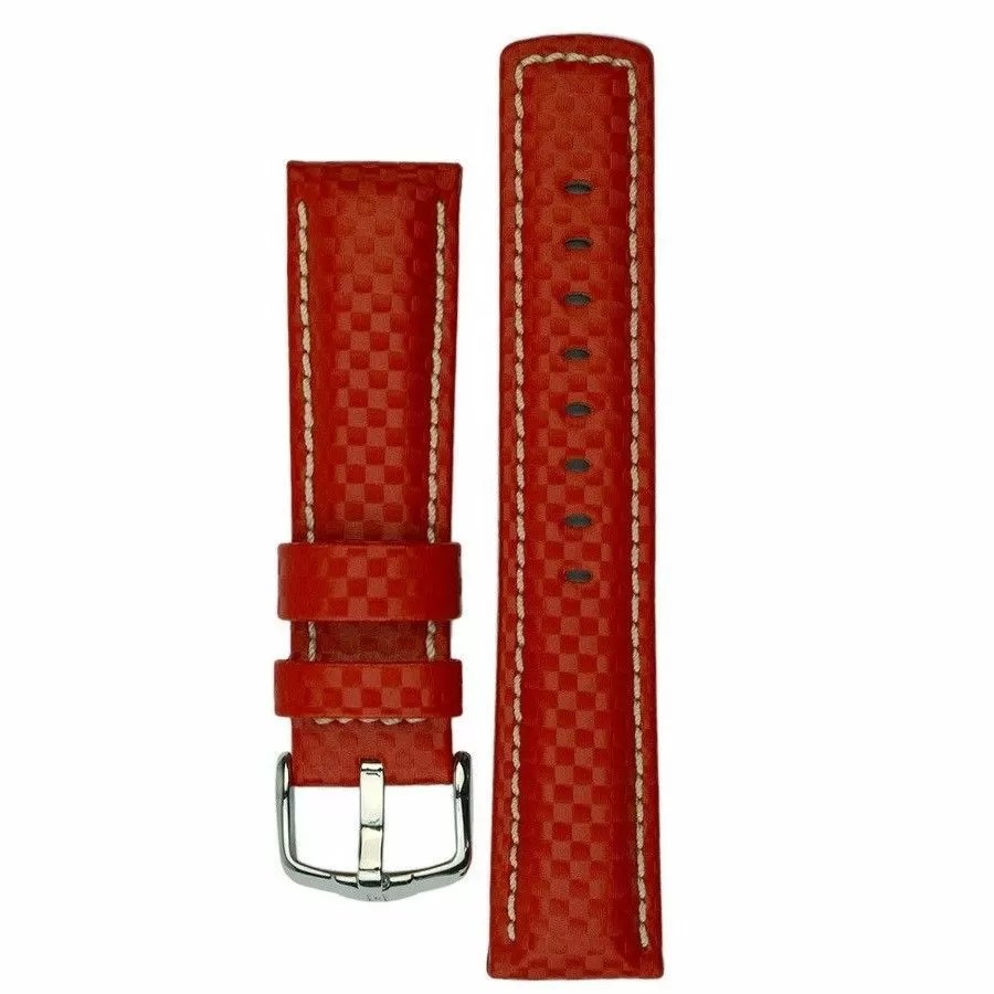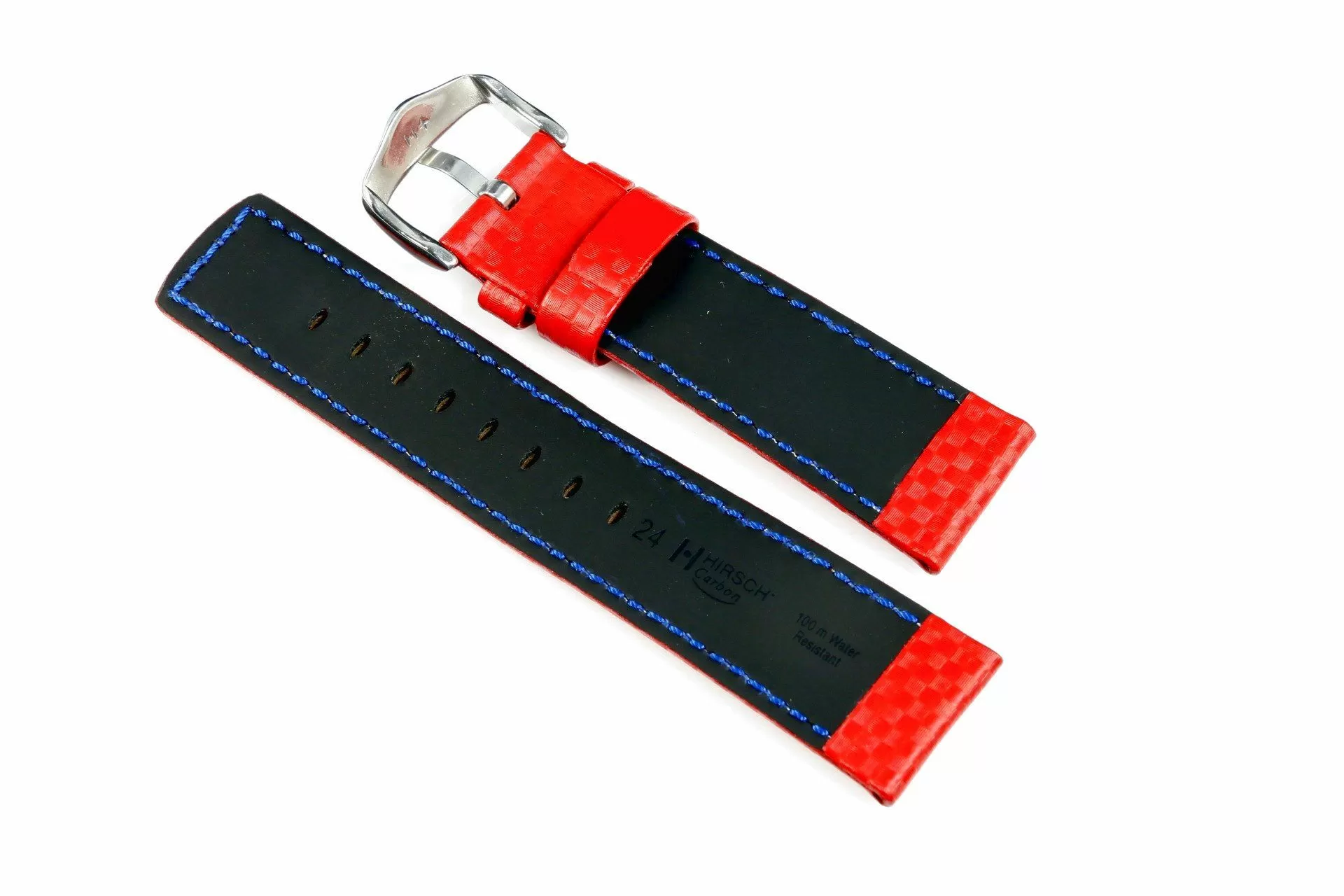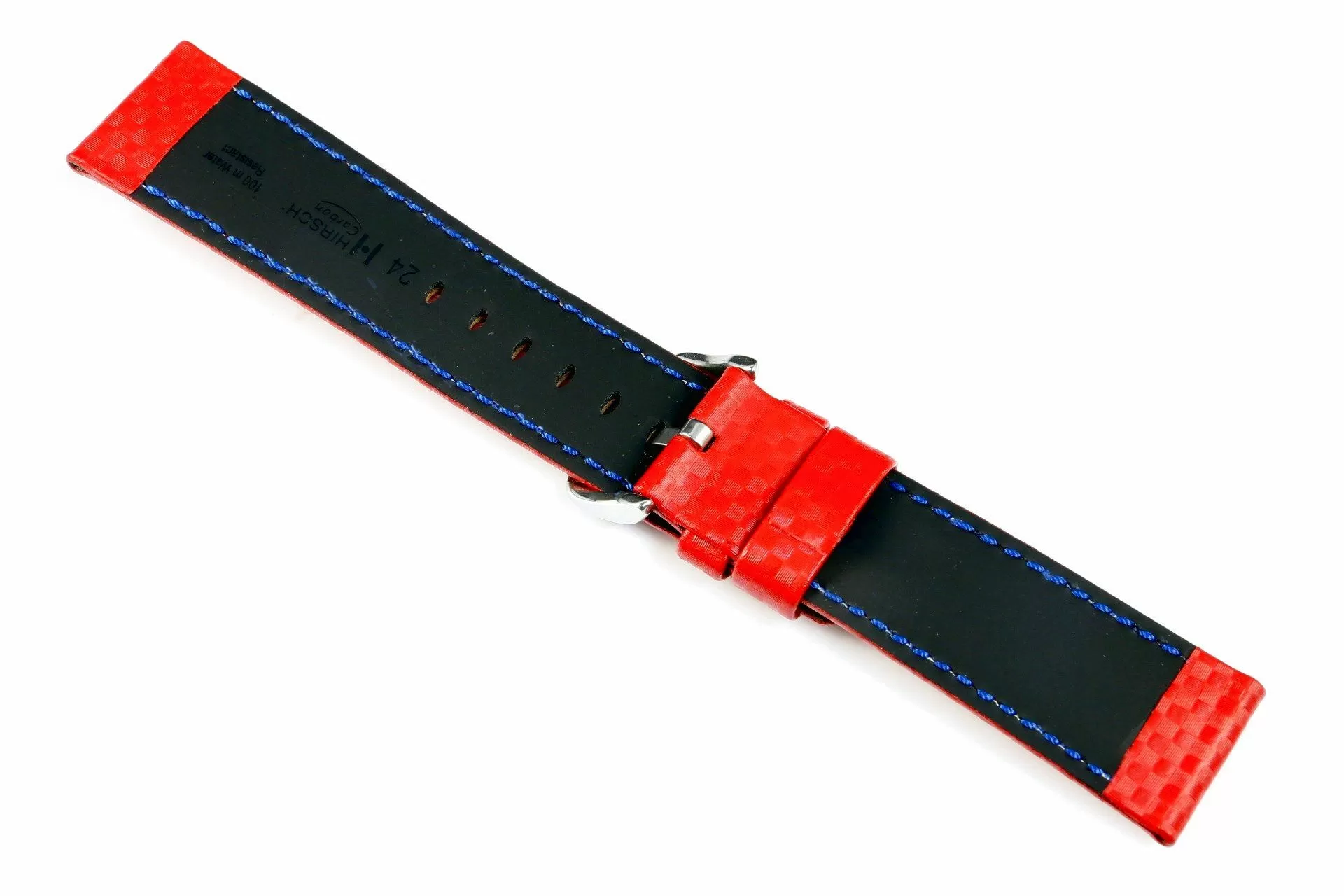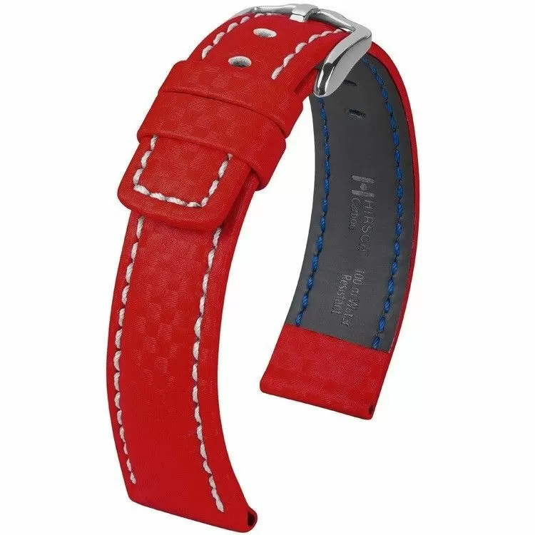 Hi-Tech czerwony pasek skórzany z lini HIRSCH Rubberlike lining leather jest pierwszy w swojej lidze  gdzie funkcja i projekt są ze sobą spójne. Wykonany ręcznie z mocnej i odpornej skóry Hi-Tech o fakturze powierzchni ze szczegółową strukturą włókien węglowych. Rozmiar 20 mm, klamerka w kolorze srebrnym , ceniona austriacka marka Hirsch. Carbon jako model należy do rodziny produktów Struktured leather i funkcjonalość Hirsch 100 m Water-Resistant co umożliwia montaż paska do wodoszczelnych zegarków z ktorymi można pływać a nawet nurkować. Przeszyty nicią w kontrastowym kolorze dla podkreślenia silnego nowoczesnego charakteru.