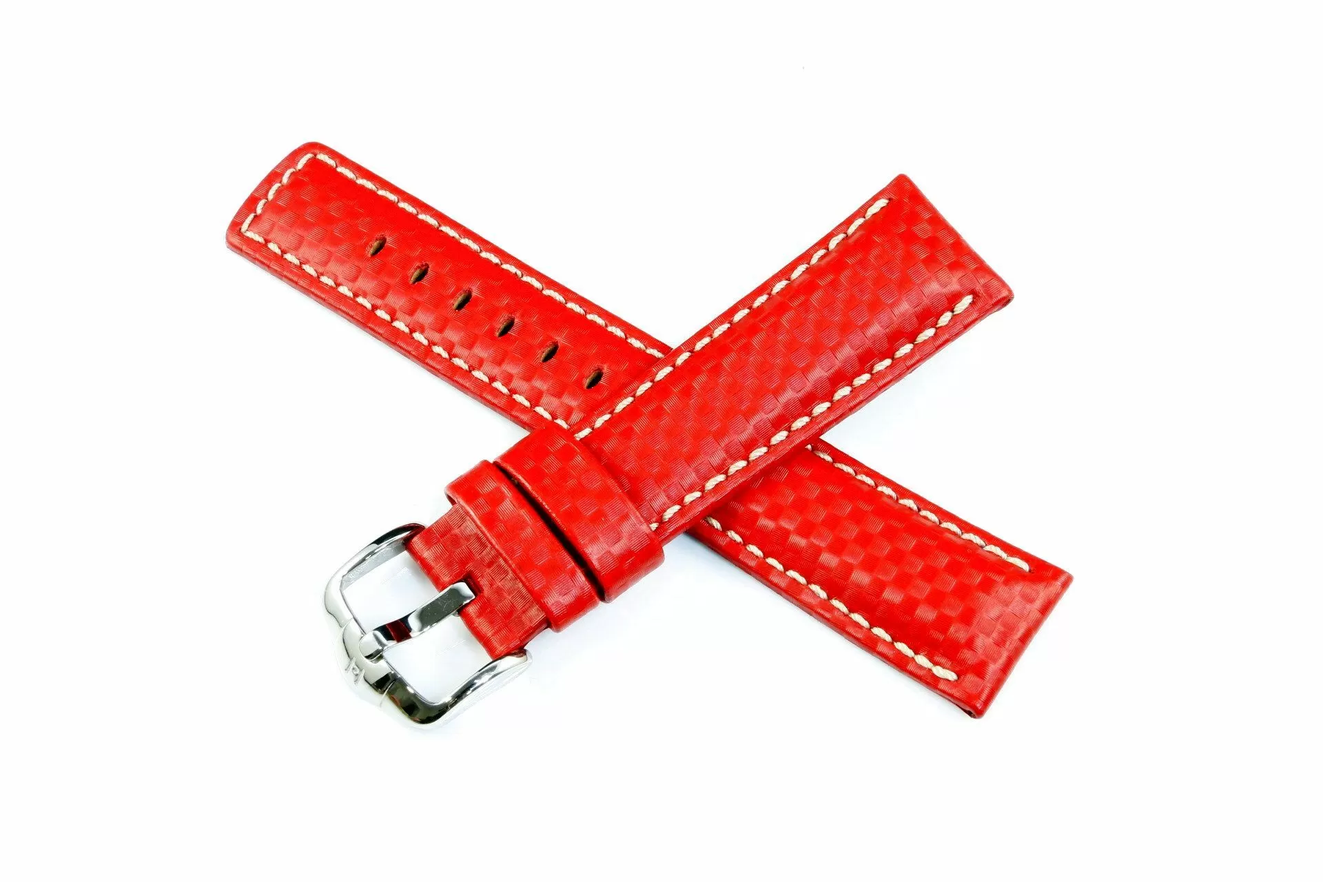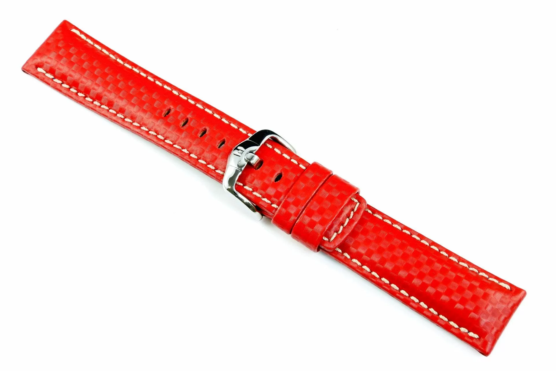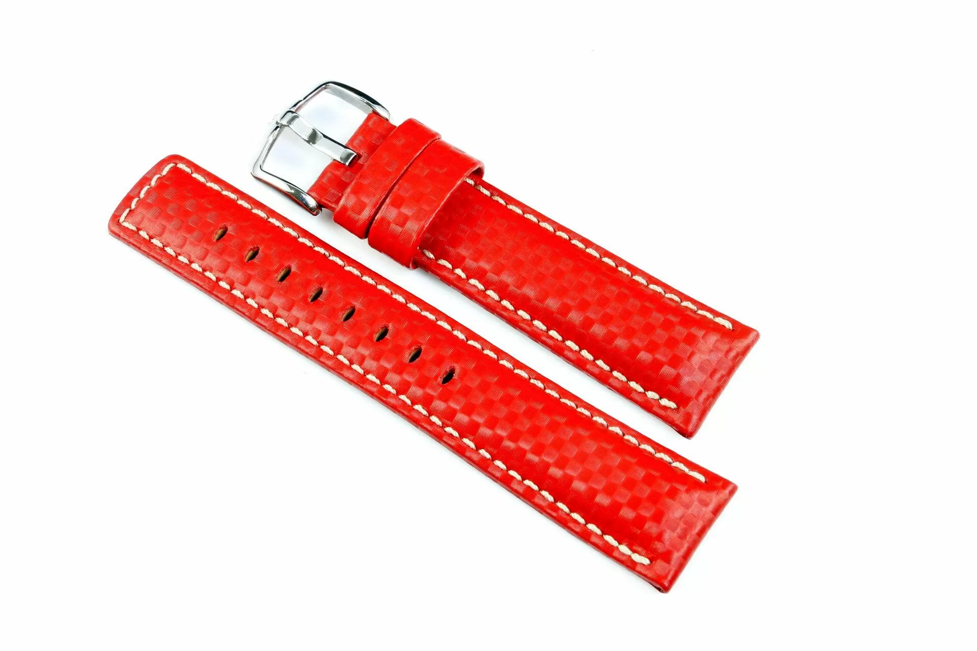 Hi-Tech czerwony pasek skórzany z lini HIRSCH Rubberlike lining leather jest pierwszy w swojej lidze  gdzie funkcja i projekt są ze sobą spójne. Wykonany ręcznie z mocnej i odpornej skóry Hi-Tech o fakturze powierzchni ze szczegółową strukturą włókien węglowych. Rozmiar 20 mm, klamerka w kolorze srebrnym , ceniona austriacka marka Hirsch. Carbon jako model należy do rodziny produktów Struktured leather i funkcjonalość Hirsch 100 m Water-Resistant co umożliwia montaż paska do wodoszczelnych zegarków z ktorymi można pływać a nawet nurkować. Przeszyty nicią w kontrastowym kolorze dla podkreślenia silnego nowoczesnego charakteru.