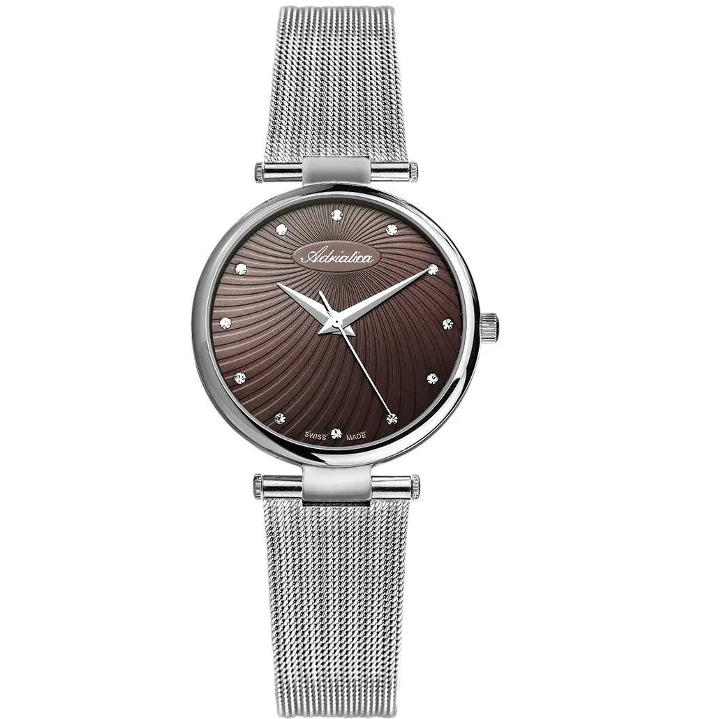 Zegarek damski Adriatica A3689.5146Q to elegancki produkt, wykonany z niezwykle ogromną dbałością o szczegóły. Jak wszystkie zegarki Adriatica, model A3689.5146Q został stworzony w oparciu o długoletnią historię zegarmistrzowską. Solidne, dokładne i niezawodne, takie właśnie muszą być zegarki damskie opatrzone logiem Swiss Made. Ten zegarek Adriatica, z linii A3689 działa na precyzyjnym mechanizmie kwarcowym, zasilanym za pomocą baterii, który charakteryzuje się wysoką dokładnością w pomiarze czasu - zakres tolerancji wynosi ok. +/- 15 sekund w przeciągu 30 dni. Koperta, o szerokości 32.00 mm, jaką posiada zegarek Adriatica A3689.5146Q wykonana została z antyalergicznej, odpornej na korozję, wysokiej jakości stali szlachetnej i ma kolor srebrny. Jej kształt jest okrągły i idealnie komponuje się z dopasowaną bransoletą typu mesh, której materiał wykonania - stal szlachetna o wysokiej odporności - gwarantuje komfortowe użytkowanie. Tarcza w tym modelu ma kolor brązowy i piękny promienisty wzór, a pełne godziny zostały oznakowane przez indeksy w formie kryształków, dzięki czemu zegarek Adriatica A3689.5146Q  jest czytelny. Tarczę tego czasomierza chroni szkło mineralne, odporne na delikatne przerysowania. Ten zegarek szwajcarski posiada wodoszczelność 3ATM - jest odporny na zachlapania np. deszcz czy mycie rąk. Styl modeli z linii Adriatica A3689 można określić jako klasyczny, a ponadczasowy design sprawia, że są to idealne zegarki dla kobiet w każdym wieku. Zegarek damski Adriatica A3689.5146Q to wyprodukowany na bazie szwajcarskich technologii czasomierz, łączący w sobie gustowne wykonanie z najwyższą jakością.