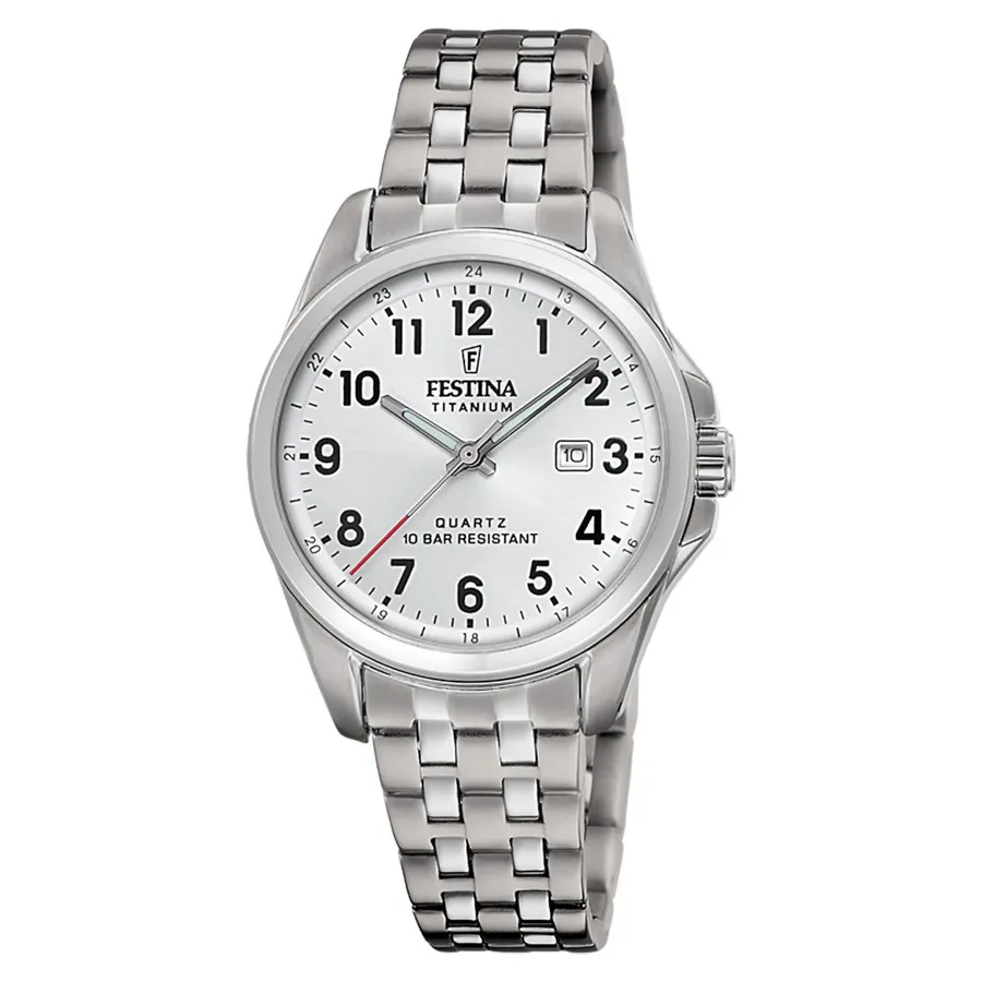 Zegarek Damski Festina Titanium 20697/1 to model na szwajcarskim mechanizmie, z mineralnym szkiełkiem, w atrakcyjnej cenie, o srebrnej okrągłej kopercie, na srebrnej tytanowej bransolecie i o białej czytelnej tarczy, z dwoma wskazówkami i oznaczeniami pełnych godzin przez indeksy i cyfrę arabską. Dodatkowym atutem zegarka jest funkcja datownika.
