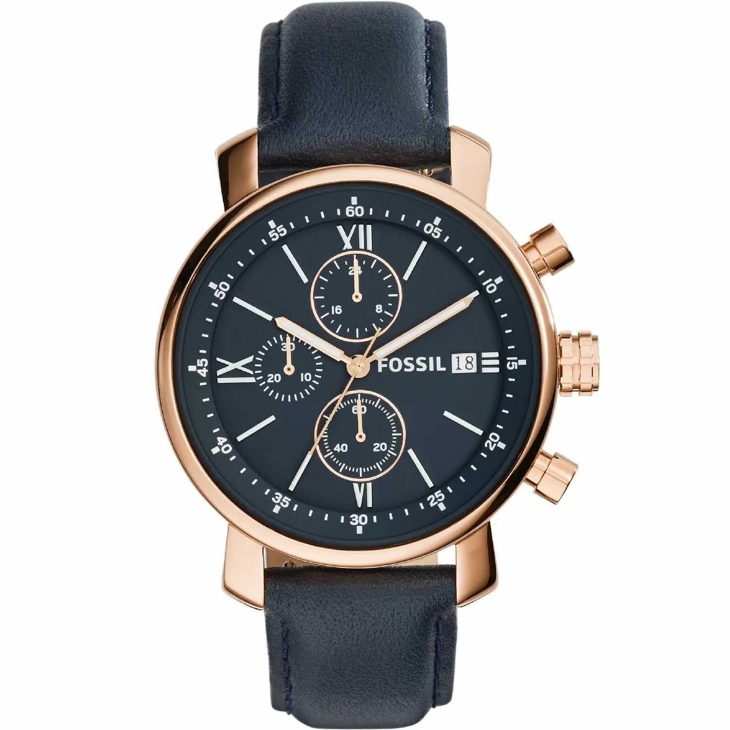 Model BQ1704 to nowoczesny czasomierz znanej i cenionej marki na rynku fashion - amerykańskiego producenta najmodniejszych akcesoriów - FOSSIL. Ten zegarek męski nie tylko będzie niezawodnie wskazywał czas, ale też będzie stylowym dodatkiem do każdej stylizacji. Jak wszystkie w kolekcji zegarki Fossil Rhett, model o symbolu BQ1704 jest połączeniem designerskiego stylu z wysokiej jakości materiałami wykonania. Koperta o szerokości 42.00 mm, której kształt jest okrągły, wykonana została z odpornej na uszkodzenia i korozję stali szlachetnej i ma kolor złota różowego. Grubość koperty w tym modelu wynosi 12.00 mm, dzięki czemu idealnie będzie prezentował się na nadgarstku każdego nowoczesnego mężczyzny. Designerski charakter, jaki posiada ten zegarek Fossil BQ1704 podkreśla idealnie dopasowany do koperty pasek, który ma kolor niebieski, wykonany z komfortowej w użytkowaniu skóry i szerokości przy uszkach koperty 20.00 mm. Zapięcie zostało idealnie dobrane do całości, jest polerowane i ma kolor różowego złota. Zegarek Fossil BQ1704 działa na dokładnym mechanizmie kwarcowym, zasilanym za pomocą baterii, ukrytym pod stylową tarczą, której niebieski odcień perfekcyjnie komponuje się z całym designem tego modnego czasomierza. Oznaczenia godzin tworzą indeksy i cyfry rzymskie, dzięki którym zegarek BQ1704 jest bardzo czytelny. Ten modny damski zegarek Fossil posiada wodoszczelność 5ATM-50m, pozwalającą na pływanie powierzchniowe, kąpiel pod natryskiem lub w wannie, którą zapewnia zakręcane wieczko. Model BQ1704 jest nie tylko stylowym dodatkiem, ale też dokładnym czasomierzem, który prócz wskazania aktualnej godziny posiada chronograf, czyli analogowy stoper i datownik. Cały design zegarka jest zgodny z najbardziej aktualnymi trendami i można go określić jako styl fashion. Zegarek Fossil BQ1704, dzięki połączeniu aktualnych trendów z najmodniejszą kolorystyką i wykonaniem z wysokiej jakości materiałów, będzie niezastąpionym dodatkiem, idealnie pasującym na nadgarstek każdego nowoczesnego mężczyzny.