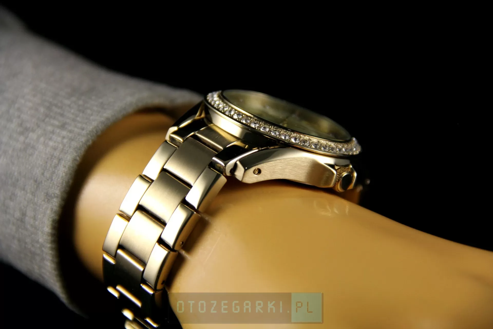 Model ES3203 to nowoczesny czasomierz znanej i cenionej marki na rynku fashion - amerykańskiego producenta najmodniejszych akcesoriów - FOSSIL. Ten zegarek damski nie tylko będzie niezawodnie wskazywał czas, ale też będzie stylowym dodatkiem do każdej stylizacji. Jak wszystkie w kolekcji zegarki Fossil Riley, model o symbolu ES3203 jest połączeniem designerskiego stylu z wysokiej jakości materiałami wykonania. Koperta o szerokości 38.00 mm, której kształt jest okrągły, wykonana została z odpornej na uszkodzenia i korozję stali szlachetnej i ma kolor złoty . Pięknie prezentuje się matowo-błyszczące wykończenie, połączone ze stalowym polerowanym pierścieniem , a wyjątkowego charakteru dodają błyszczące, modne kryształy, w ilości 45 sztuk osadzone w obudowie, w odcieniu neutralnym. Grubość koperty w tym modelu wynosi 12.00 mm, dzięki czemu idealnie będzie prezentował się na nadgarstku każdej nowoczesnej kobiety . Designerski charakter, jaki posiada ten zegarek Fossil ES3203 podkreśla idealnie dopasowana do koperty bransoleta, która ma kolor złoty, wykonana z wysokiej jakości stali szlachetnej o błyszcząco-matowym wykończeniu i szerokości przy uszkach koperty 18.00 mm. Na bransolecie umieszczono 30 pięknie mieniących się w świetle kamieni. Zapięcie zostało idealnie dobrane do całości, jest szczotkowane i ma kolor złoty. Zegarek Fossil ES3203 działa na dokładnym mechanizmie kwarcowym, zasilanym za pomocą baterii, ukrytym pod stylową tarczą, której beżowy odcień perfekcyjnie komponuje się z całym designem tego modnego czasomierza. Oznaczenia godzin tworzą cyfry arabskie i indeksy , dzięki którym zegarek ES3203 jest bardzo czytelny. Na tarczy umieszczono akcentujące biżuteryjny charakter kamienie, w ilości 19 sztuk, pięknie podkreślające damski wygląd. Ten modny damski zegarek Fossil posiada wodoszczelność 10ATM, pozwalającą na kąpiel, a nawet pływanie z nurkowaniem bez akwalungu, którą zapewnia zakręcane wieczko. Model ES3203 jest nie tylko stylowym dodatkiem, ale też dokładnym czasomierzem, który prócz wskazania aktualnej godziny posiada multidatownik, czyli rozbudowany datownik. Cały design zegarka jest zgodny z najbardziej aktualnymi trendami i można go określić jako styl fashion. Zegarek Fossil ES3203 , dzięki połączeniu aktualnych trendów z najmodniejszą kolorystyką i wykonaniem z wysokiej jakości materiałów, będzie niezastąpionym dodatkiem, idealnie pasującym na nadgarstek każdej nowoczesnej kobiety.
