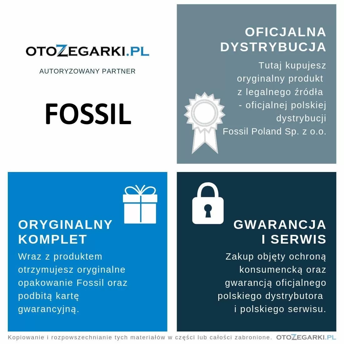 Kupując u nas w sklepie nie musisz obawiać się rozczarowania! Wszystkie stylowe zegarki Fossil i biżuteria Fossil z naszej oferty to oryginalne, nowe i pełnowartościowe produkty, które pochodzą z legalnej polskiej dystrybucji, która także zapewnia serwisowanie w Polsce i dostęp do części. Zakup w naszym sklepie jest całkowicie legalny i zgodny z polskim prawem, co gwarantuje Ci ochronę jako konsumenta w przypadku zakupów na odległość! Przy zakupie zegarka Fossil bądź biżuterii Fossil otrzymujesz: