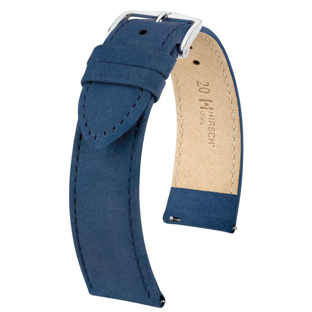 Klasyczny płaski granatowy pasek skórzany z lini HIRSCH Osiris Nubuk przekonuje dyskretnym wyglądem i efektem nubuku aksamitnie delikatnego w dotyku jaki zapewniają mistrzowie w swoim fachu z firmy HirschWykonany ręcznie  z cielęcej stabilnej wymiarowo, ale elastycznej  i miękkiej skóry. Rozmiar 20 mm, klamerka w kolorze srebrnym , ceniona austriacka marka Hirsch. Osiris jako model należy do rodziny produktów Struktured leather . Przeszyty nicią w kolorze paska jest idealny do każdego zegarka do codziennego użytku.