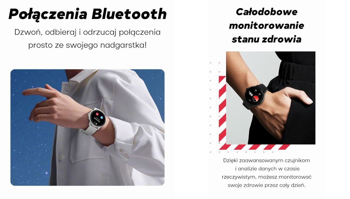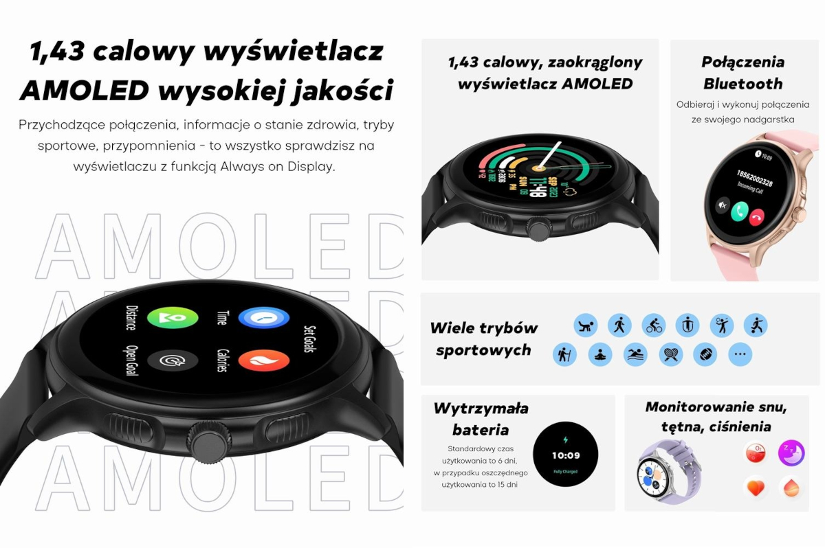 1.43‑calowy dotykowy ekran AMOLED o rozdzielczości 466×466 px zapewnia żywe kolory i doskonałą widoczność w każdych warunkach oświetleniowych. Intuicyjne interfejsy, precyzyjne reakcje na dotyk i funkcja „obudź ekran ruchem nadgarstka” - wszystko to w przyjaznej formie.