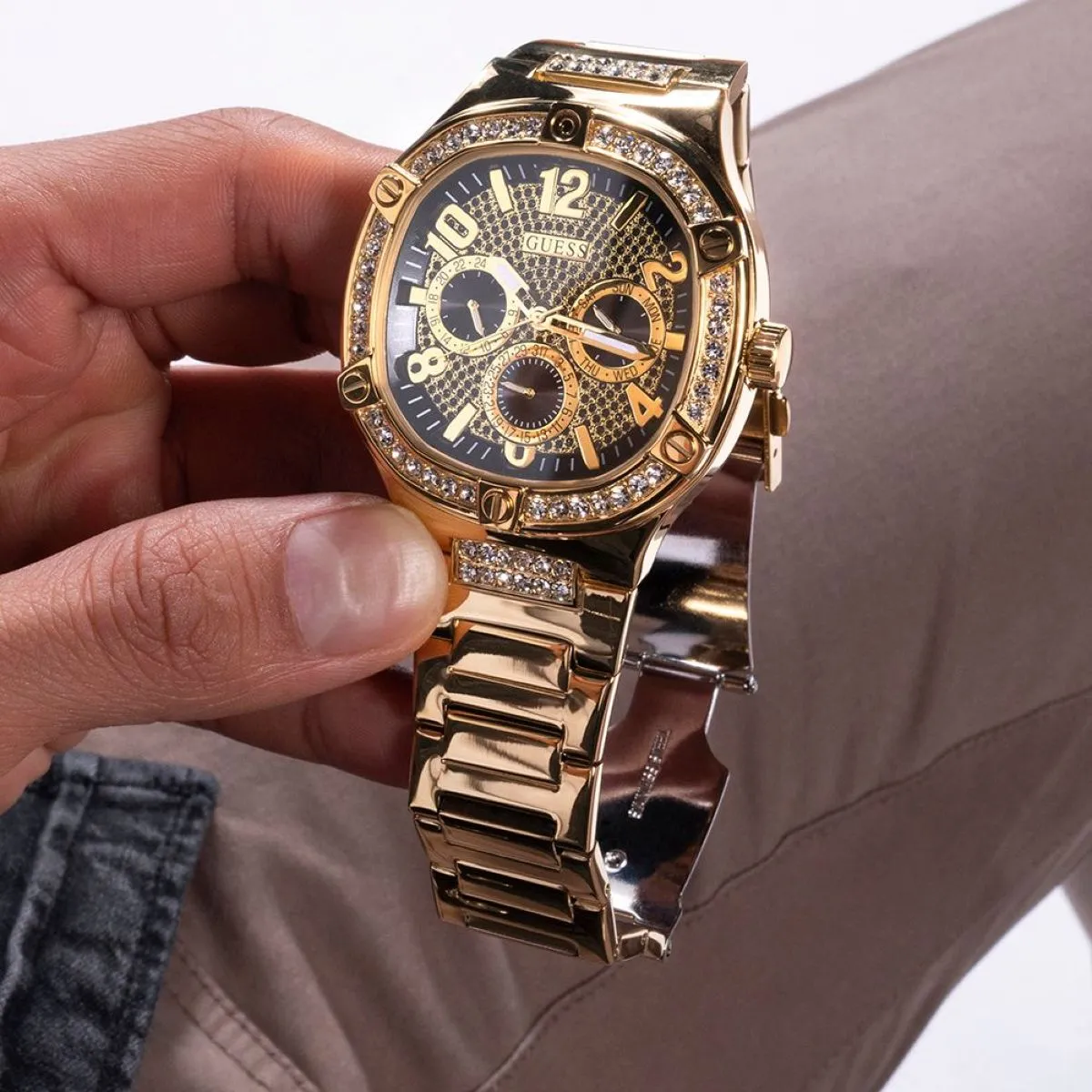 W kwestii wykończenia marka Guess często zaskakuje, nie brak rozwiązań opartych na kamieniach Swarovskiego, o czym już wspominaliśmy. Często nawet tarcza jest nimi wypełniona, co może się podobać. Producent zastosował jednak również zmienne kolory koperty, dzięki czemu każdy może wybrać ten, który najbardziej mu odpowiada, a wersji jest naprawdę wiele.