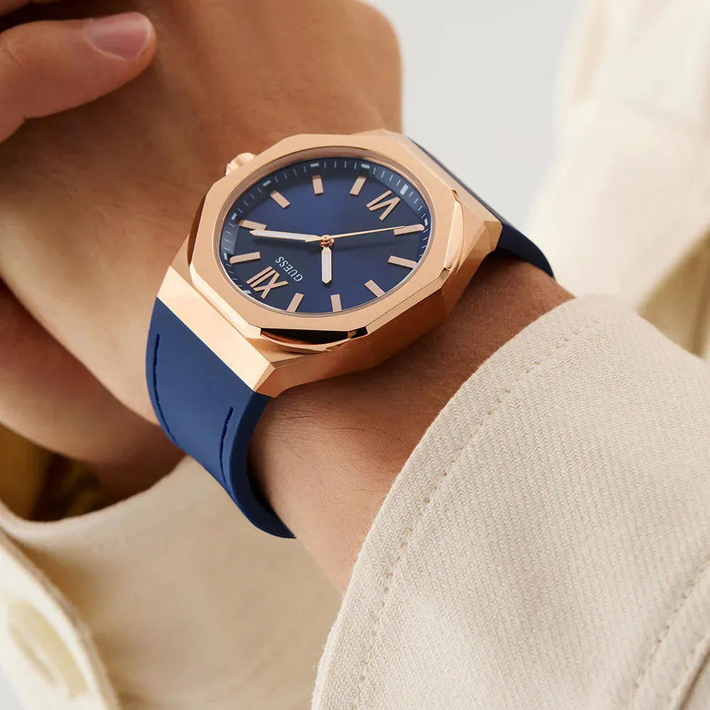 Zegarek Guess Emperor GW0850G3 został zaprojektowany z myślą o mężczyźnie, który ceni wyraziste dodatki, ale nie idzie na kompromisy w kwestii jakości. Głęboki błękit połączony z różowym złotem, tworzy kompozycję przyciągającą uwagę, ale z wyczuciem. To wybór dla pewnych siebie – tych, którzy wiedzą, kim są i nie boją się tego pokazać.