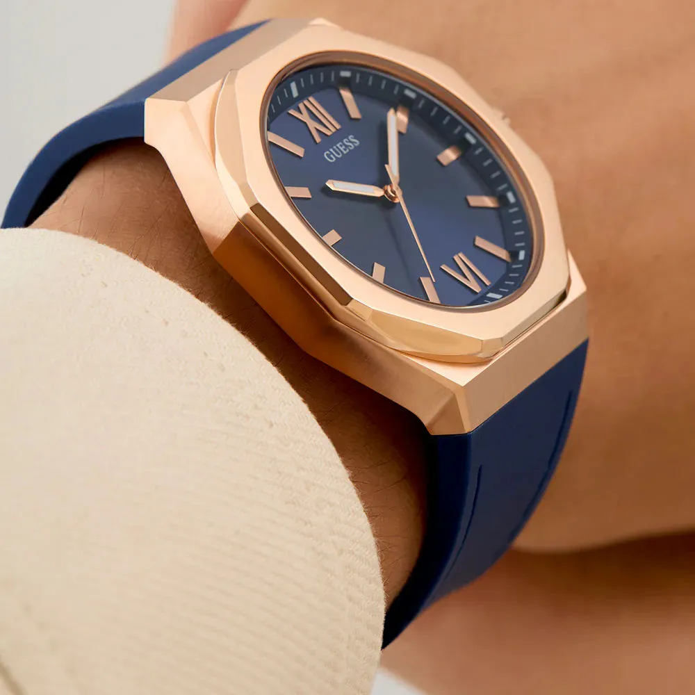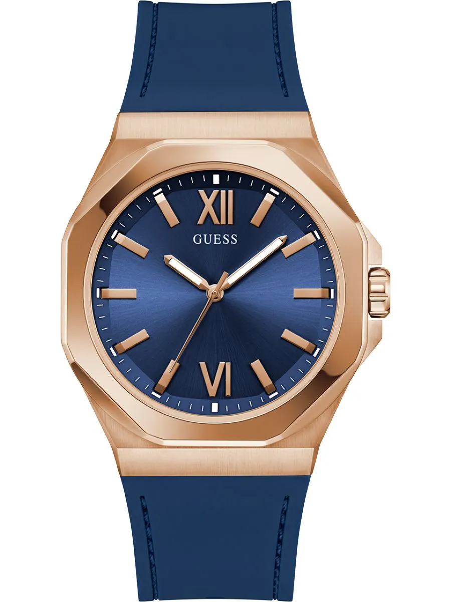 Zegarek Guess Emperor GW0850G3 to połączenie rózowego złota i granatu, które przyciąga spojrzenia. Kwarcowy mechanizm, stalowa koperta, pasek, masywna obudowa, klasyczny design. Styl i funkcjonalność dla pewnych siebie mężczyzn.