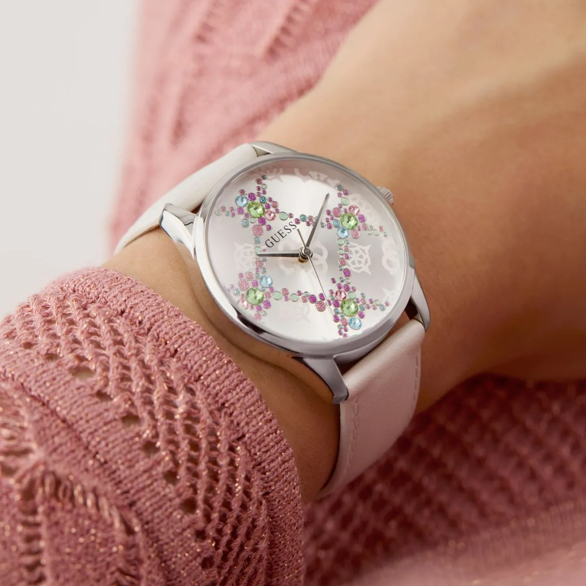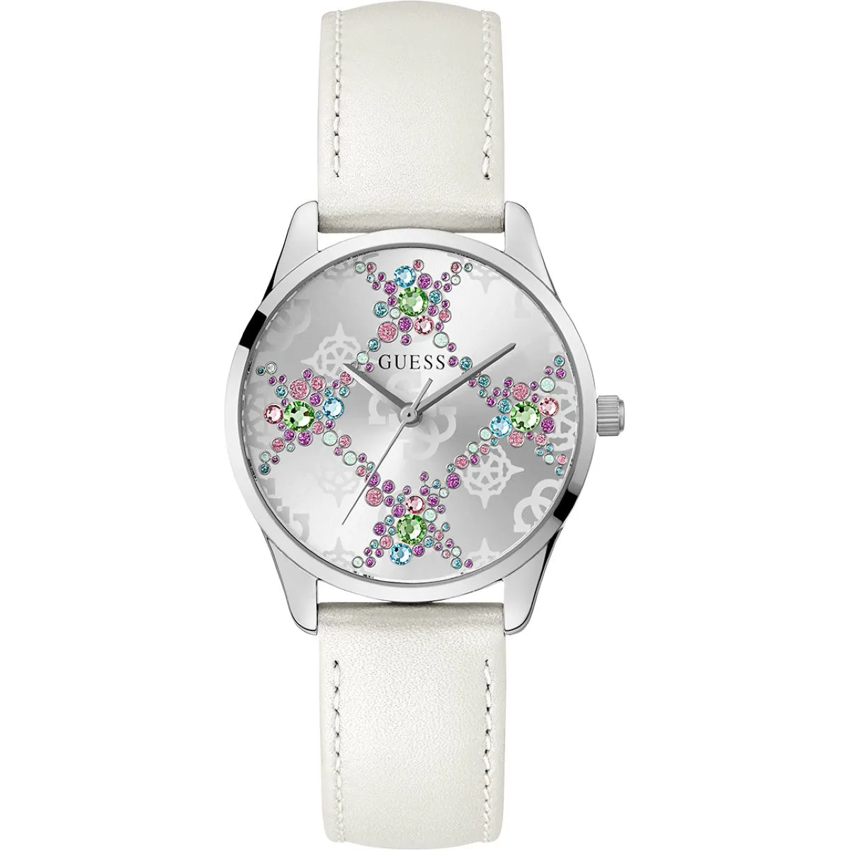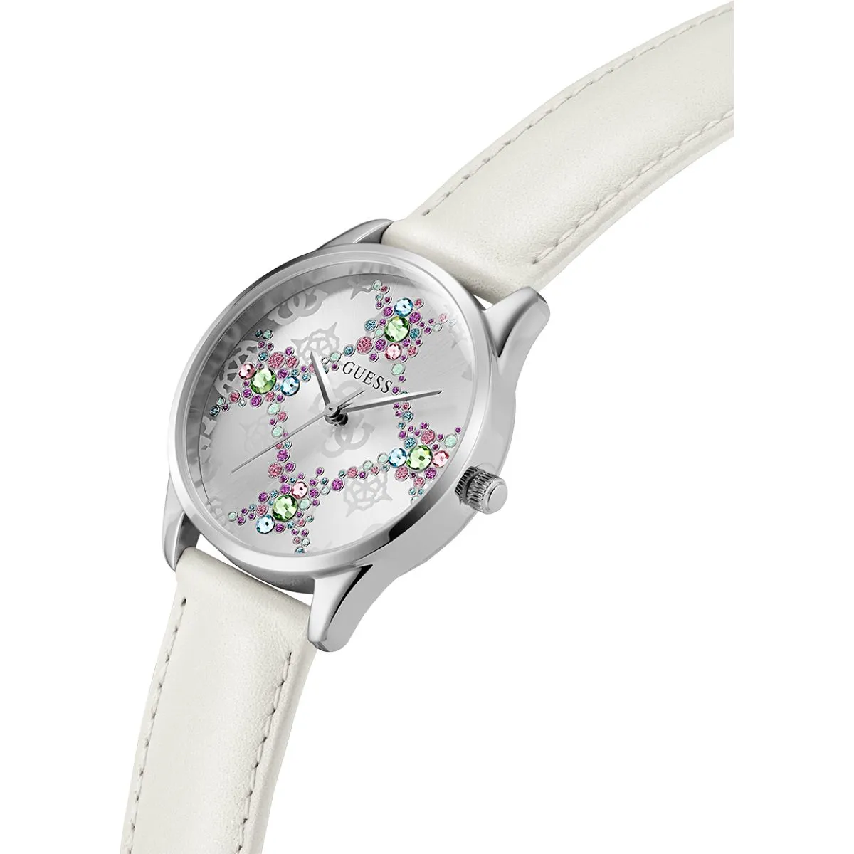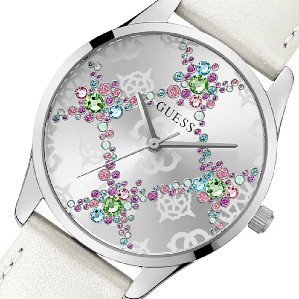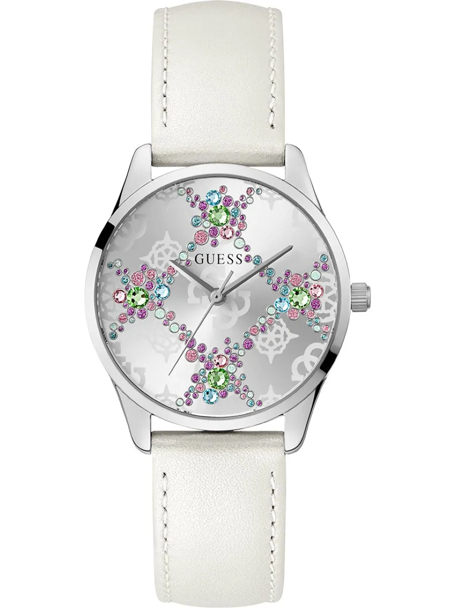 Guess Luster GW0837L1 z białym paskiem i kolorywmi kryształkami to więcej niż zegarek – to biżuteria na nadgarstku, która przyciąga spojrzenia i podkreśla pewność siebie. Połączenie srebra, bieli i kolorowych kryształów sprawia, że ten model natychmiast staje się centrum uwagi. Jeśli szukasz damskiego zegarka, który łączy modowy charakter z ponadczasową elegancją, jesteś we właściwym miejscu.