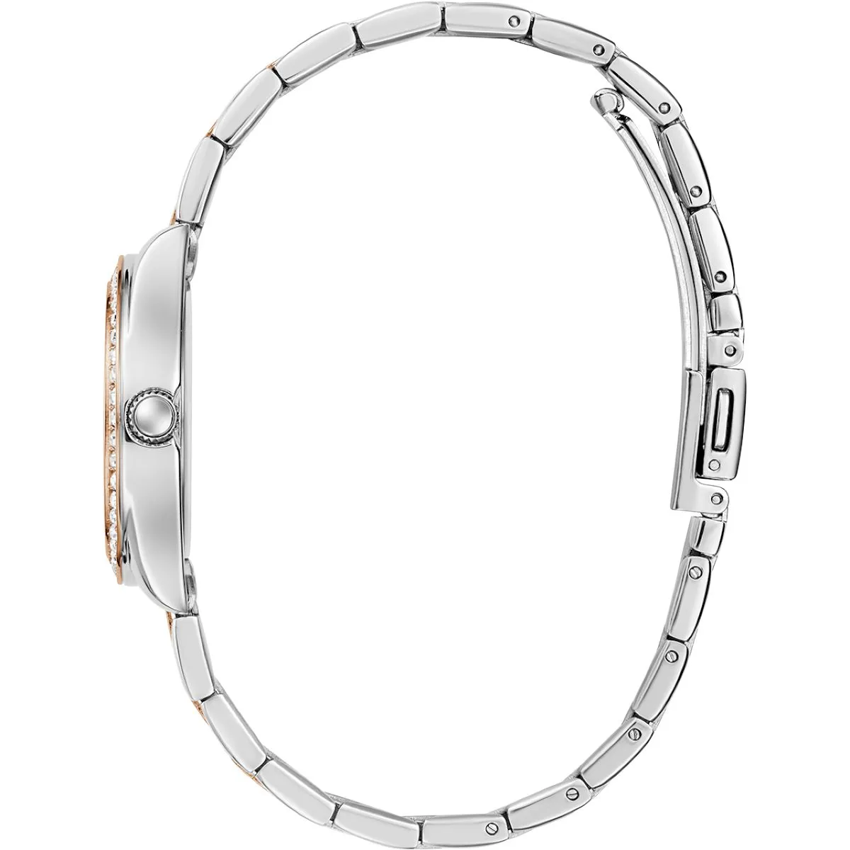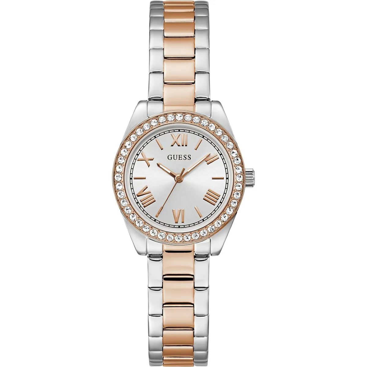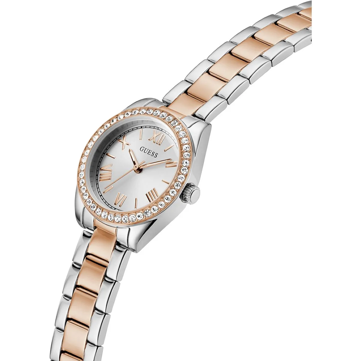 Guess Mini Luna srebrny zegarek damski na bransolecie z różowozłotymi detalami GW0841L3