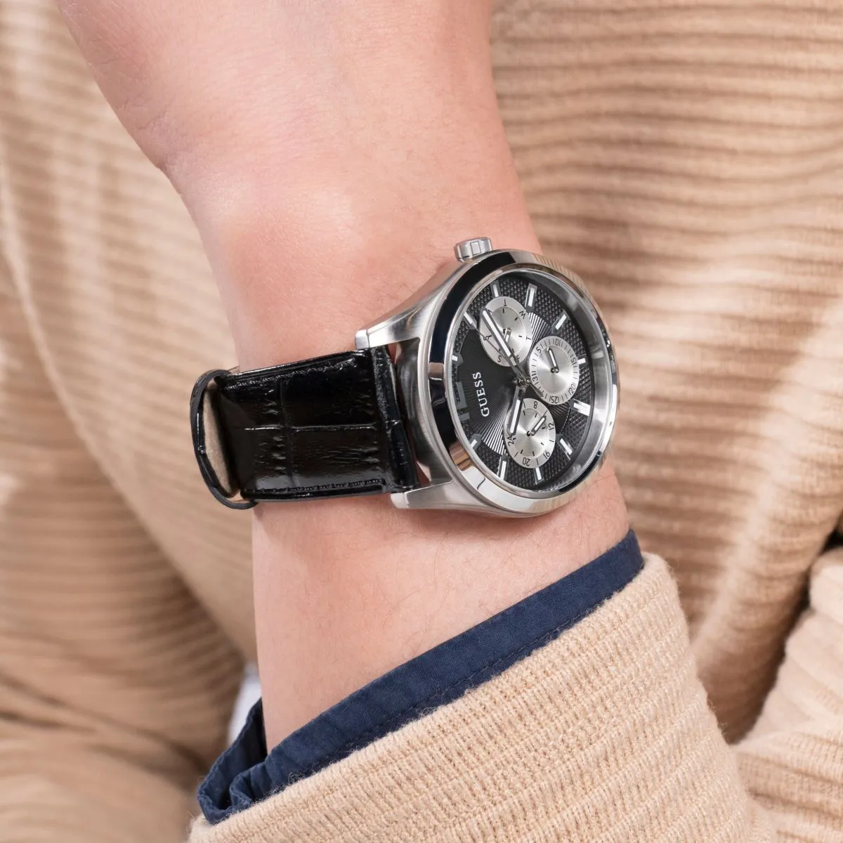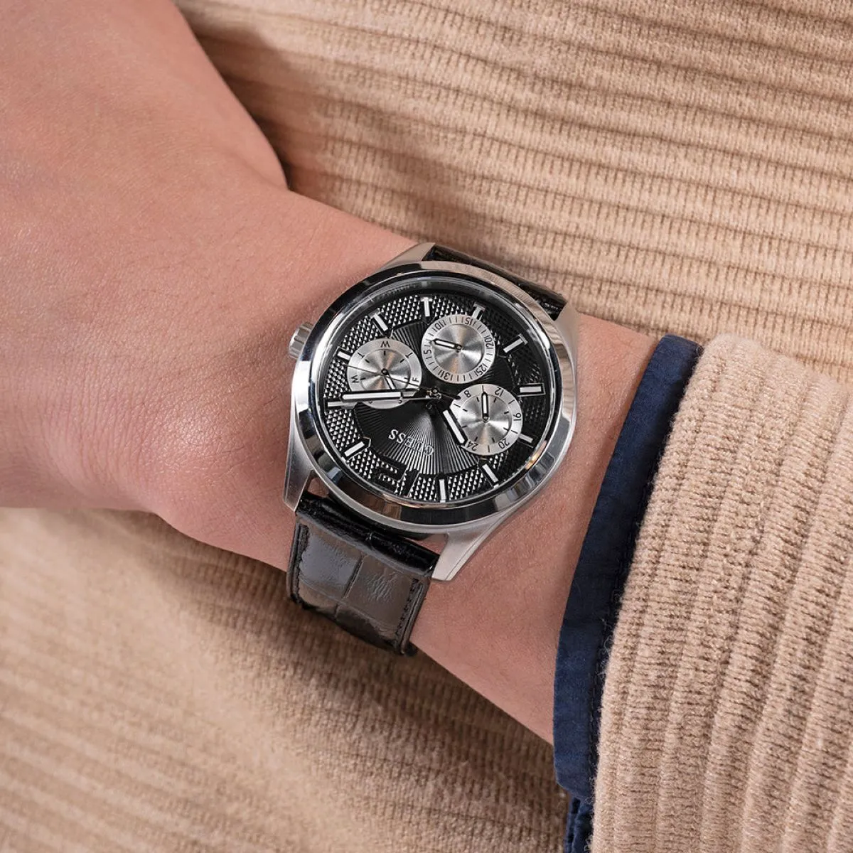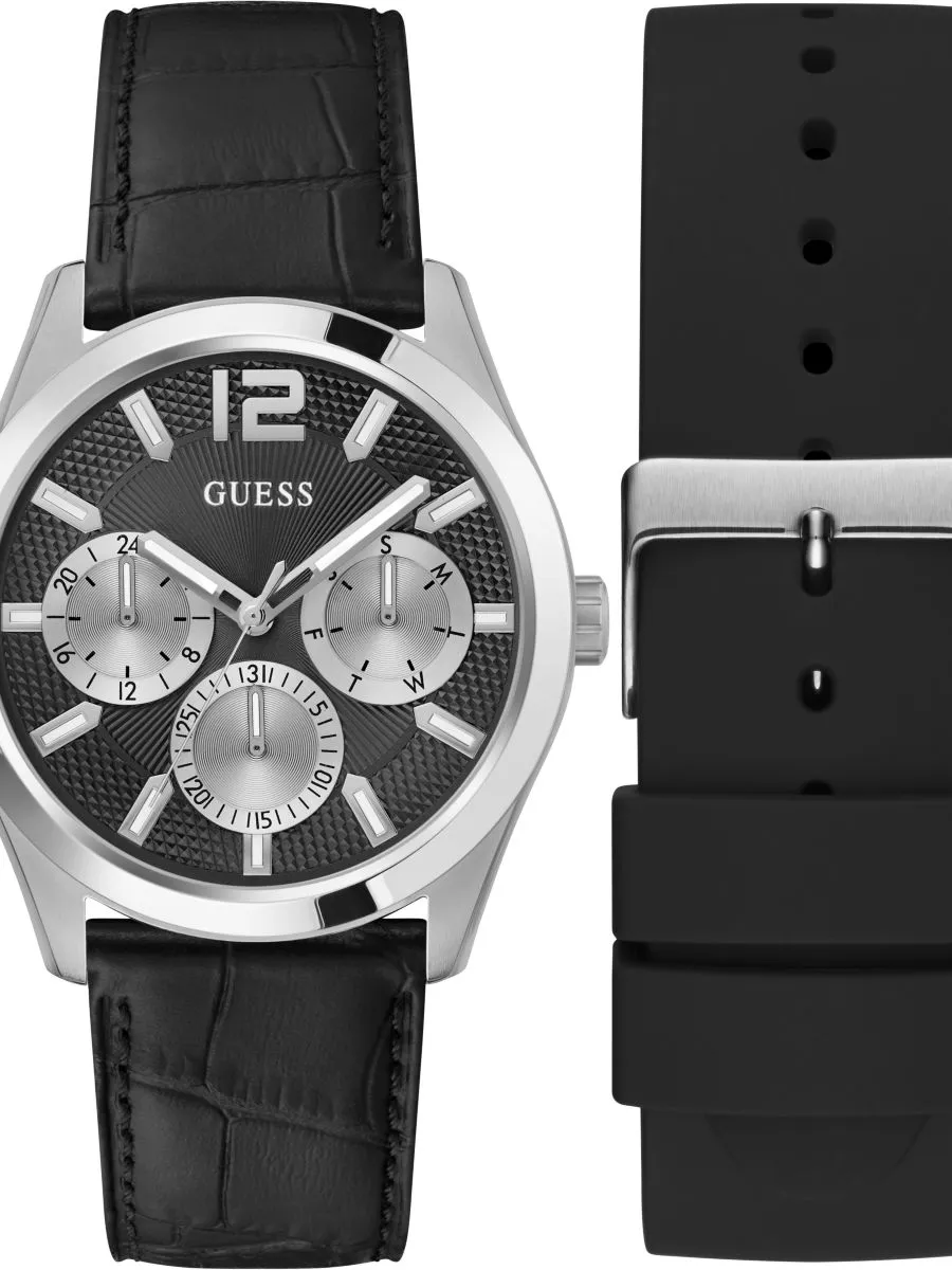 Zegarek Guess Zen GW0809G1 z dwoma paskami w zestawie​ to połączenie srebra i czerni, które przyciąga spojrzenia. Kwarcowy mechanizm, stalowa koperta, dwa czarne paski w zestawie i multidatownik na tarczy. Styl i funkcjonalność dla pewnych siebie mężczyzn.