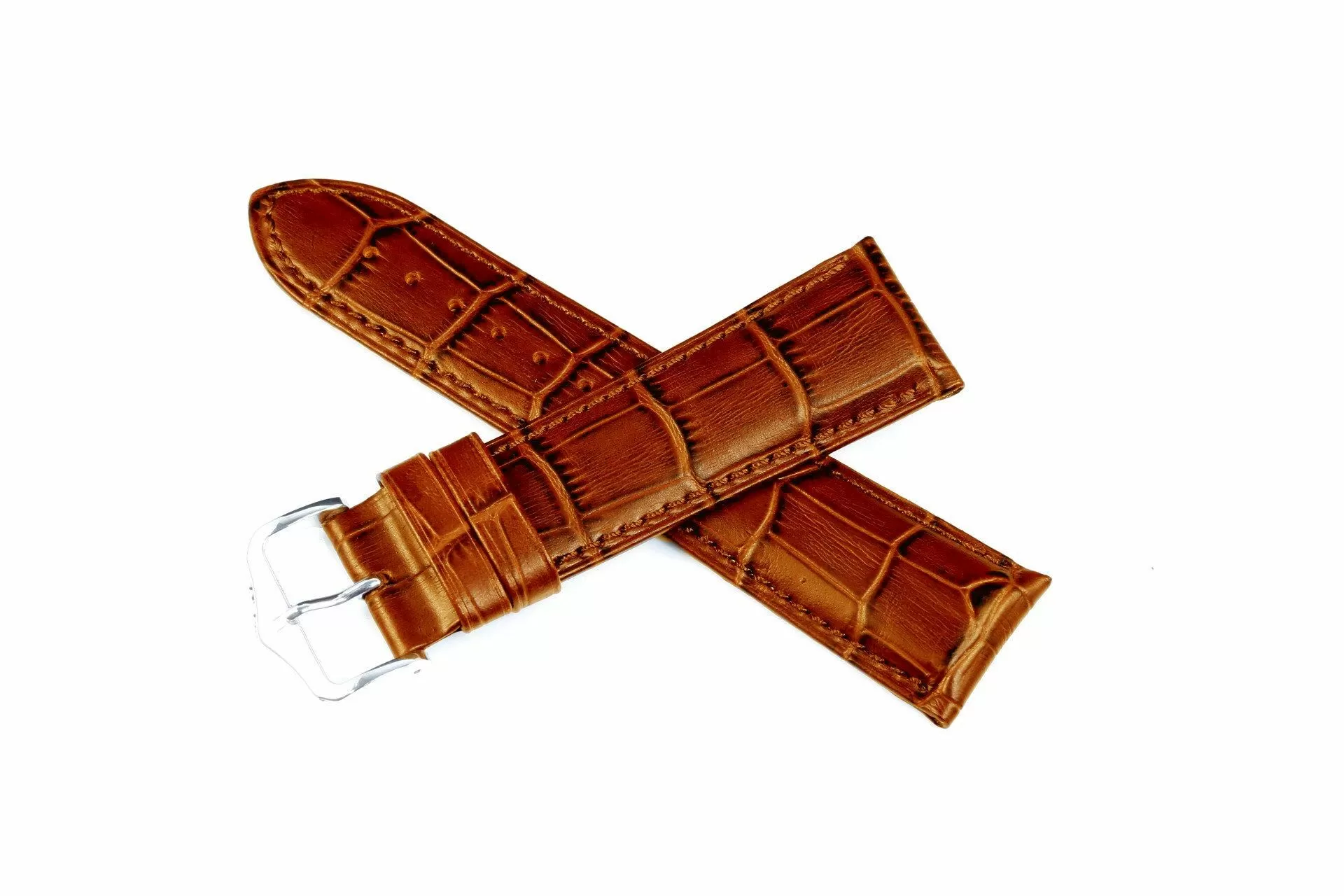 Unikalny jasnobrązowy pasek skórzany z lini Hirsch Alligator embossed wykonany najlepszej  włoskiej skóry cielęcej . Z naturalnie wyglądającą półbłyszczącą w dwóch tonach powierzchnią ze specjalnym przetłoczeniem oddającym rzeczywistą strukturę skóry Aligatora z Luisiany w prostokąne łuski. Rozmiar 18 mm, klamerka w kolorze złotym, ceniona austriacka marka Hirsch. DUKE jako model  należy do rodziny produktów Exotic embossed leather. Niesamowity kształt, luksusowy wyraz, piękny pasek skórzany wykonany ręcznie do eleganckich zegarków. Pasek z pierwszorzędnej,miękkiej i wygodnej włoskiej skóry cielęcej rewelacyjnie sprawdzi się jako dodatek do zegarka na codzień. Dla trwałości i wzmocnienia pasek został przeszyty nicią w kolorze paska, nadając mu tym samym unikatowego charakteru i żywotności.