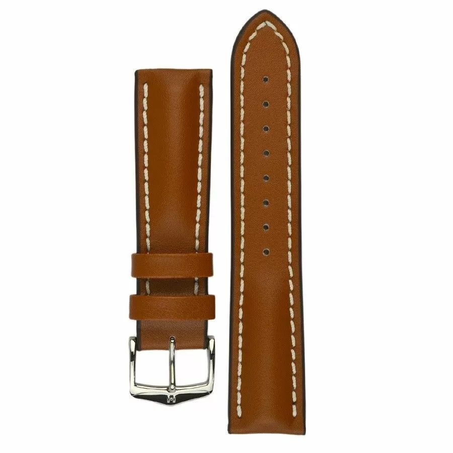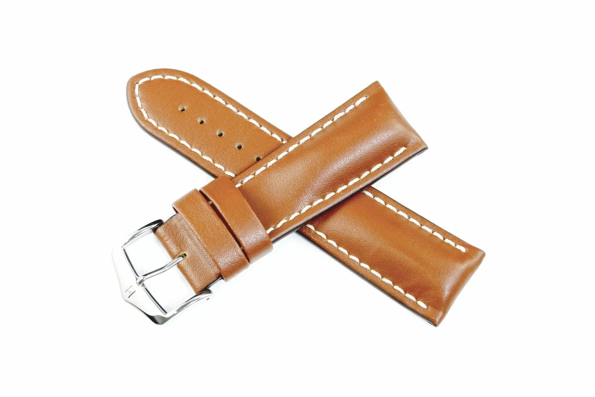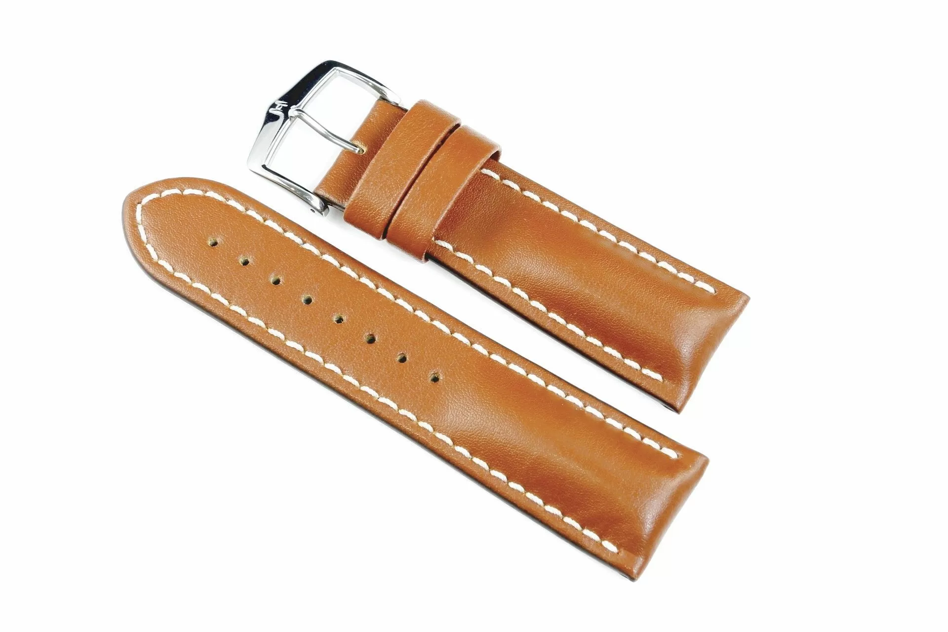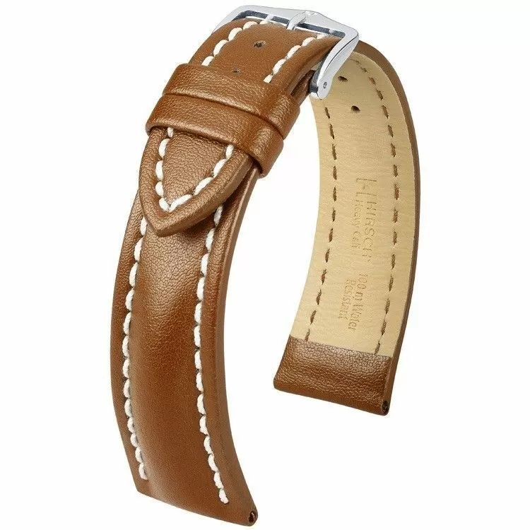 Solidny jasnobrązowy pasek skórzany z lini HIRSCH Scratch-Resistant  oraz HIRSCH 100m Water-Resistant wykonany z odpornej na zadrapania i wodoszczelne wloskiej skóry cielęcej  umożliwia zamontowanie go do sportowego zegarka z którym można pływać a nawet nurkować do 100 mRozmiar 18 mm, klamerka w kolorze srebrnym, ceniona austriacka marka Hirsch. Heavy Calf jako model  należy do rodziny produktów Untruktured leather. Masywne kształty, uniwersalno-sportowy wyraz, pasek skórzany wykonany ręcznie do zegarków sportowych. Model ten pomimo zdecydowanych kształtów wykonany jest miękkiej skóry i rewelacyjnie sprawdzi się jako dodatek do zegarka na każdy dzień . Dla trwałości i wzmocnienia pasek został przeszyty nicią w kontrastowym jasnym kolorze , nadano mu tym samym wyraźnego charakteru i sportowej nuty.